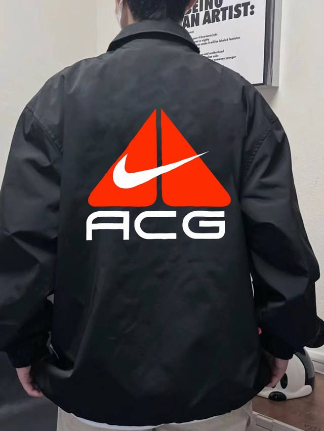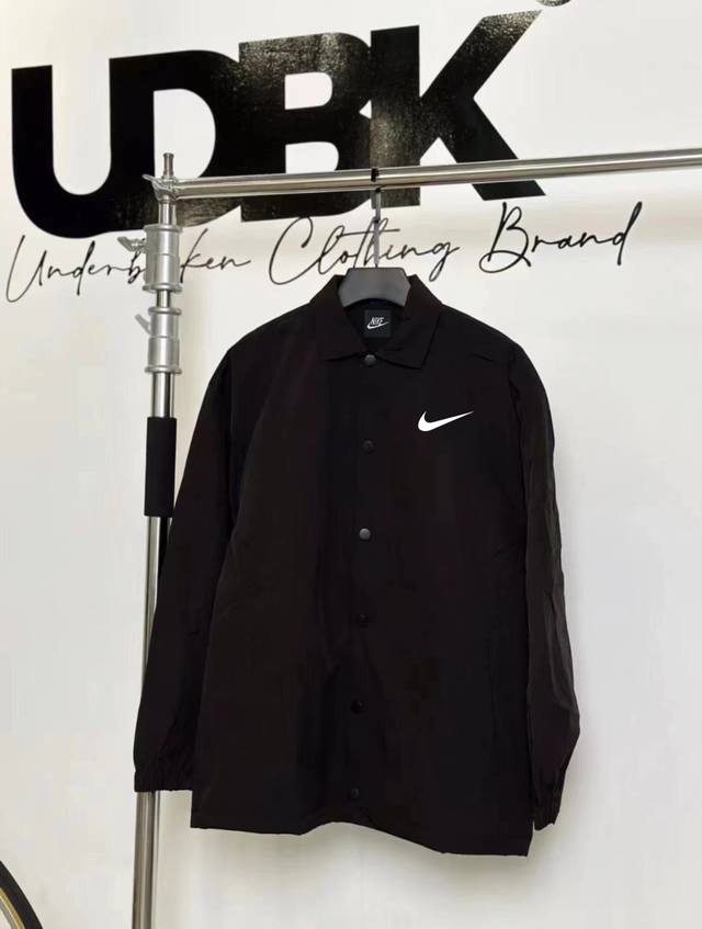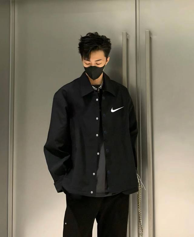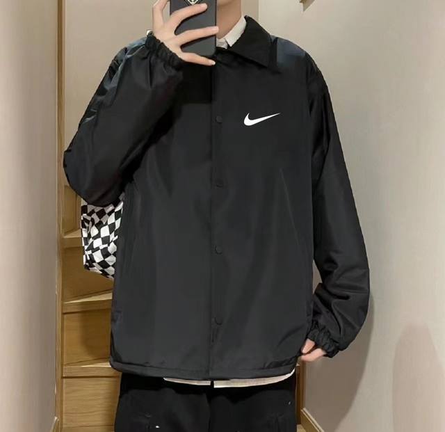 Nike Coach Jacket with Small Swoosh Stand Collar. Made from selected high-quality woven, thick, even, smooth, moisture-wicking, wear-resistant, and wrinkle-resistant fabric. The loose fit and three-dimensional tailoring provide ample room for movement. The lapel design easily creates a stylish look. Perfect for spring, this jacket adds a touch of sophistication. The logos on the chest, front, and back are printed using a high-power film machine, ensuring they won't crack or deform even after washing. Custom accessories and three tags complete the look. It's incredibly stylish and versatile, suitable for both men and women. While possessing a retro feel, it also aligns with current trends. It's flattering, slimming, and eye-catching, attracting attention and looking great in photos. Color: Black. Size: ML XL. Size Chart: Length: 70 72 74. Shoulder Width: 52 53 56. Chest: 126 132. Manual measurement, error approximately 1-2 cm.