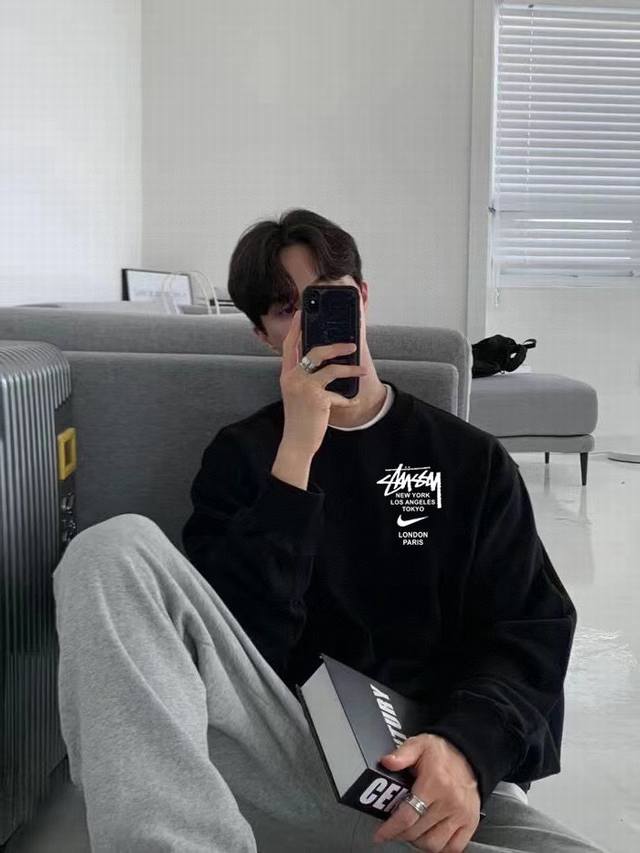 Stussy x Nike Spring/Autumn Crewneck Sweatshirt. Made from premium Xinjiang Chinese cotton fabric, this sweatshirt is soft and comfortable, with a delicate, high-weight design. It's incredibly lightweight and comfortable, offering a relaxed fit that's effortless and effortless. High-quality prints ensure comfortable, skin-friendly cuffs, collar, and hem are made from premium ribbed fabric, ensuring ironing resistance and abrasion resistance. Buy with confidence! Custom-made with the official website's original three-label logo. Ensure quality control. Color: Black, Dark Gray. Sizes: M-L, XL. Bust: 60-70. Shoulder: 125-62-72. Length: XL, 64-74. Note: Manual measurements may vary by 1-3 cm.