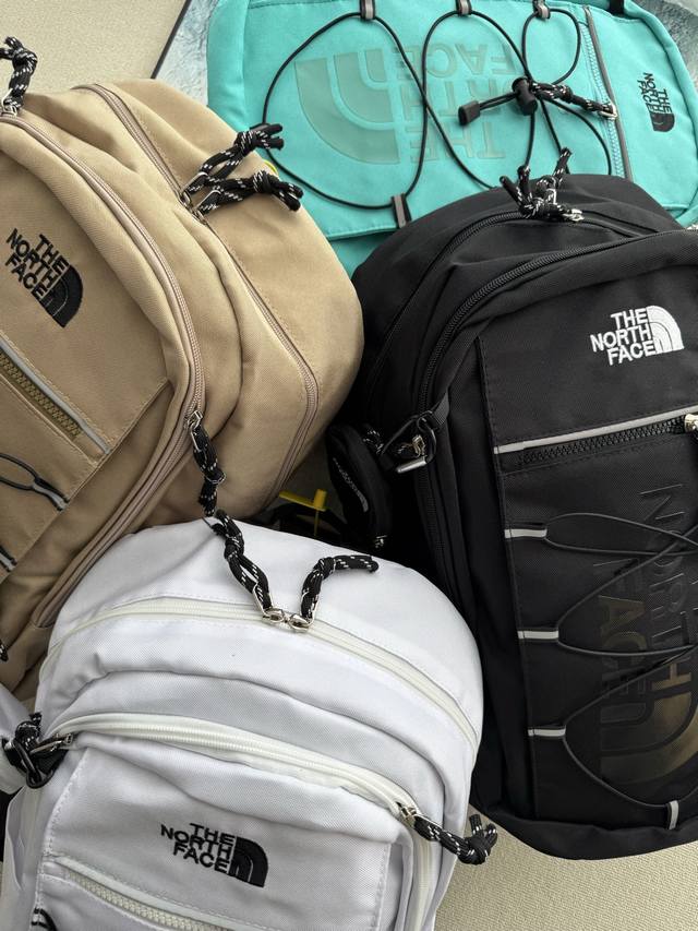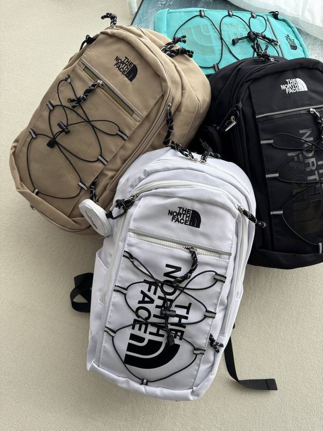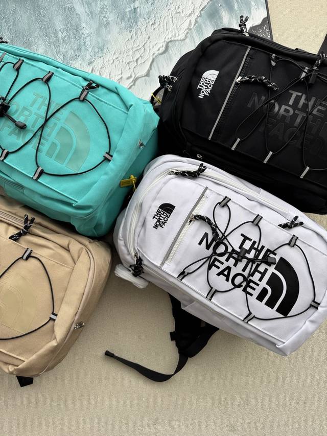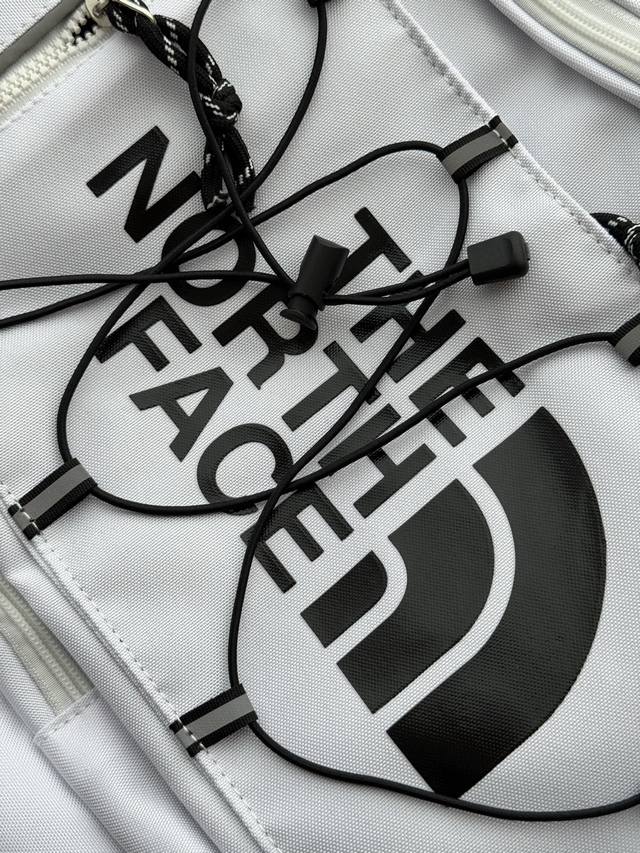 The North Face Borealis backpack, a unisex, casual hiking and mountaineering backpack, features a spacious main compartment with a two-way zipper for flexible opening and closing. It includes a built-in storage compartment for daily necessities and a 15-inch laptop compartment for organized storage and easy access. The North Face Backpack Tech, with its injection-molded Flexvent elastic and harness system, provides a perfect fit and comfort, even under heavy loads. The padded back panel features longitudinal ventilation slots and a PE plate for added back support. The front panel features a cord for clothing storage or various other uses, and the bottom of the front panel can be used to attach webbing, carabiners, lights, and more. Mesh pockets on the side panels hold water bottles and other items, and side ties prevent movement and enhance comfort. The bottom is constructed from 1680 denier high-strength fabric, protecting the bag from external friction and preventing sagging. The twill weave in the floor shifts the center of gravity toward the waist and back panel, reducing the perceived weight. It's suitable for everyday use, travel, and simple hiking.