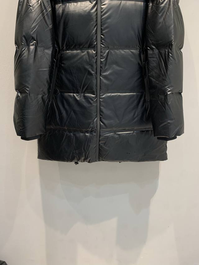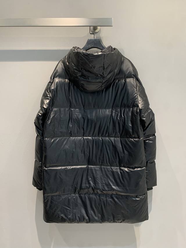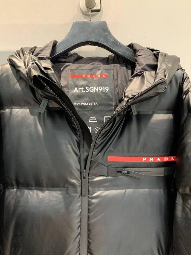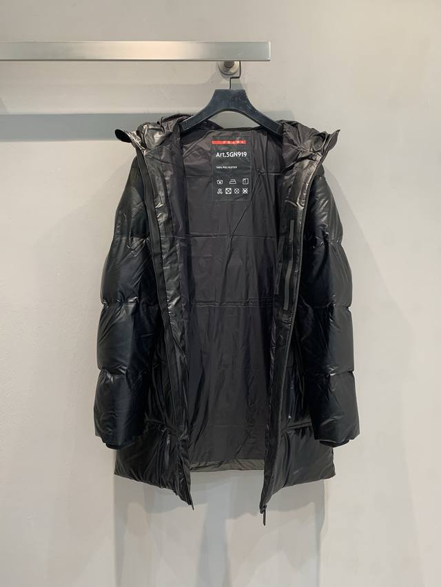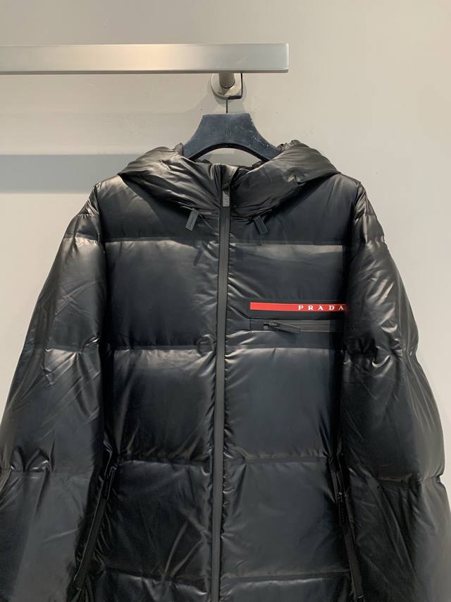New Arrival! Prad* 2025 Autumn/Winter New Red Label Hooded Mid-Length Down Jacket. Black nylon fabric + 90% white duck down filling, warm yet lightweight. Waterproof and sealed seams, windproof and waterproof, super practical. Sizes: Spl