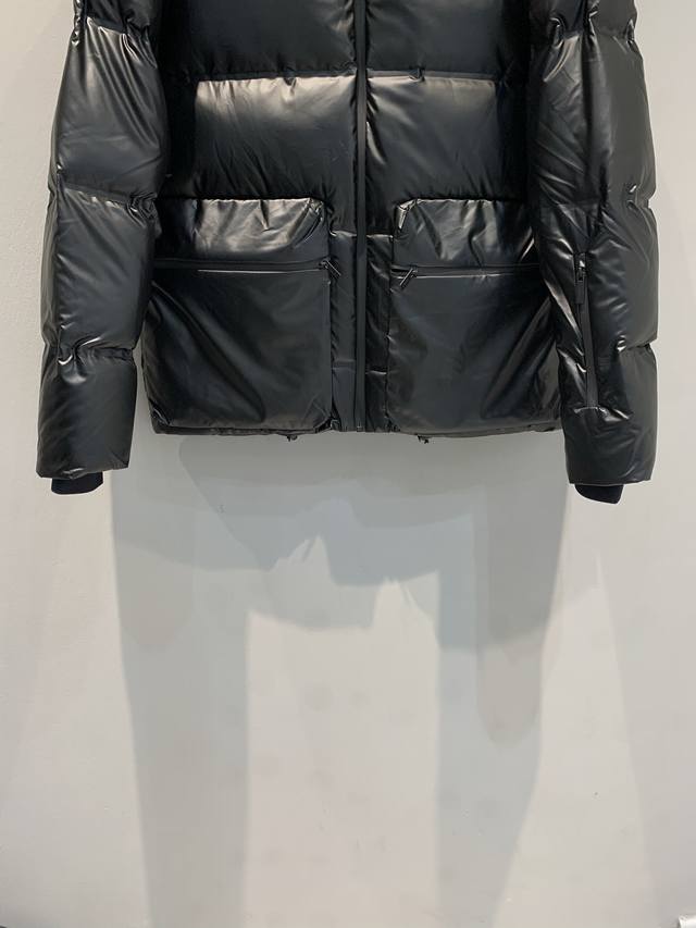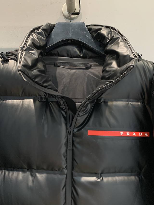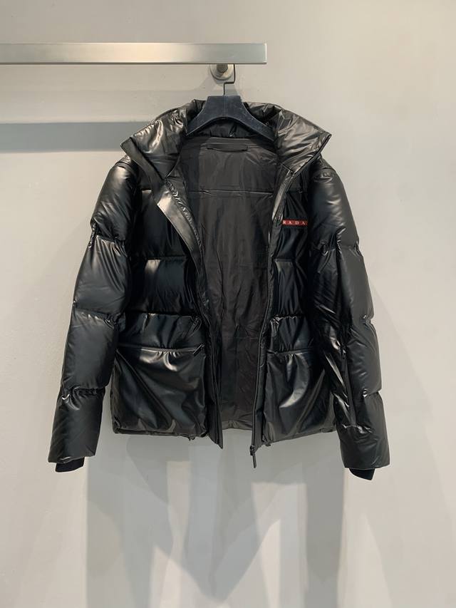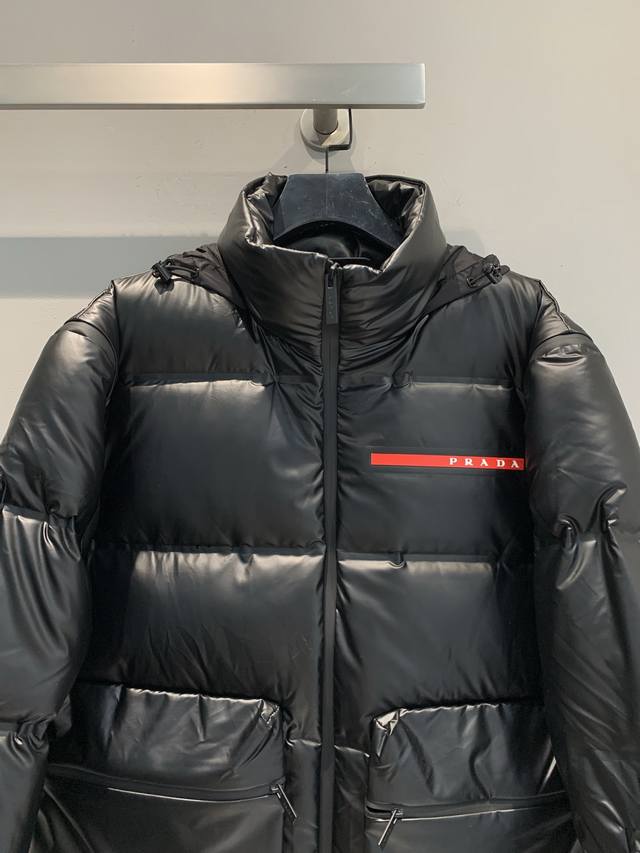 New Arrival! Prad*Linea Rossa Red Label Down Jacket with Large Pockets and Stand Collar. Made with double-layered lightweight bonded nylon fabric, it's windproof, waterproof, and breathable. The 90% white duck down filling provides excellent warmth. The hooded design and detachable sleeves offer two ways to wear it