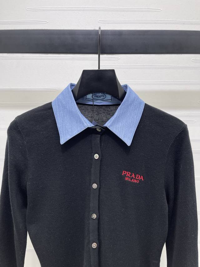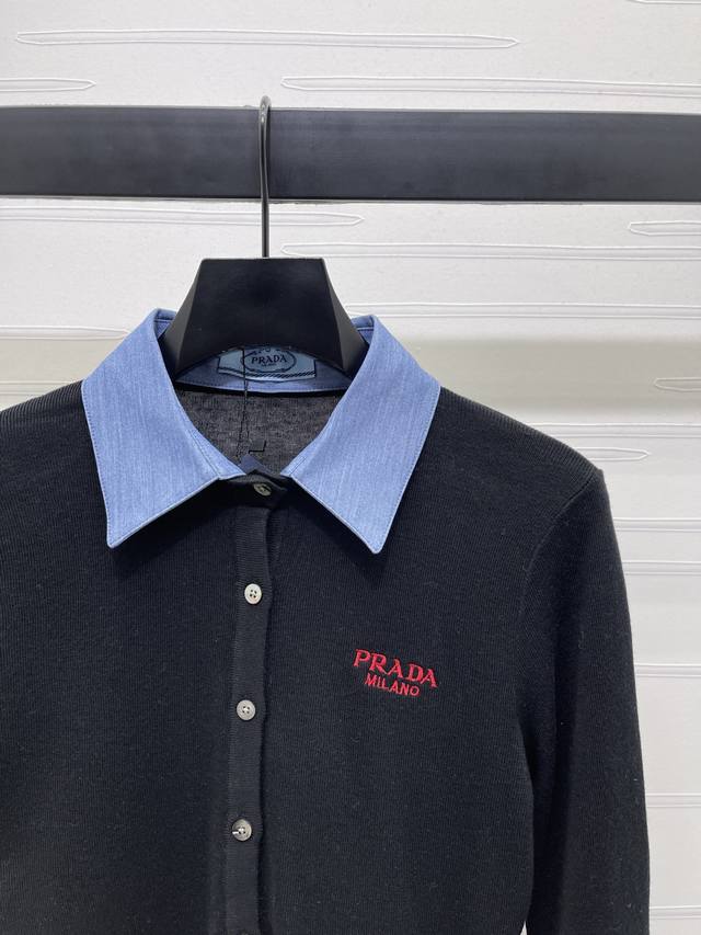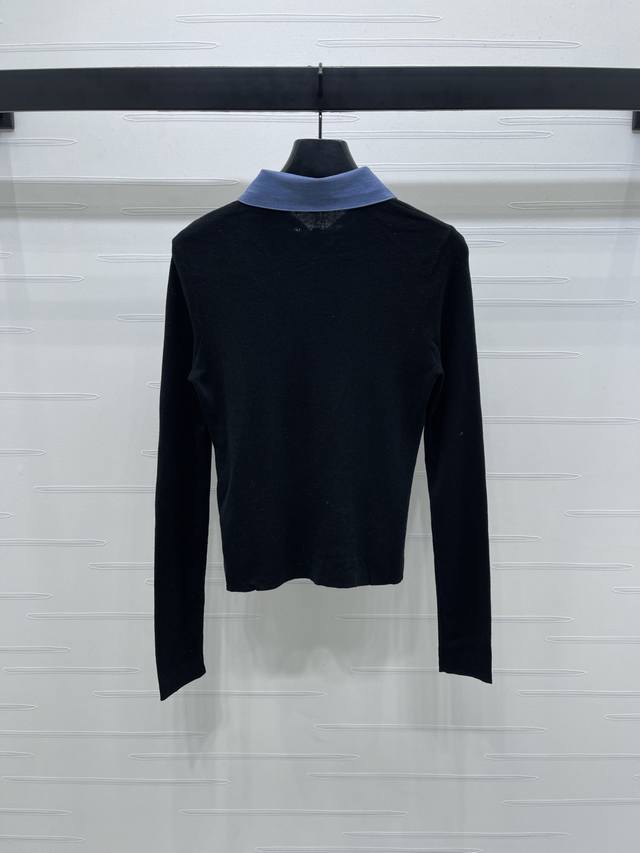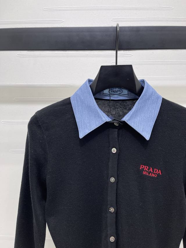 New, original, high-quality Prad* 2025 Early Fall Collection! Contrast-colored polo-neck knitted long-sleeved cardigan! Custom-made wool knit material, comfortable and soft, with a stretchy lapel and long sleeves. One-sided contrast embroidered logo accents highlight the style. Vertical stripes throughout the knit fabric are stretchy and form-fitting, flattering your figure. Perfect for everyday wear and everyday activities! 2 colors! Sizes SM-L3! High-quality, bulky stock A706B460C