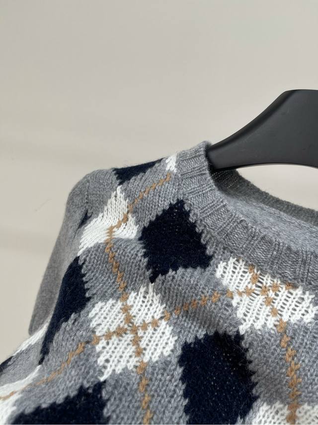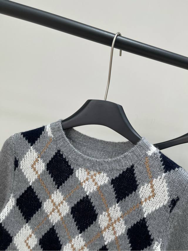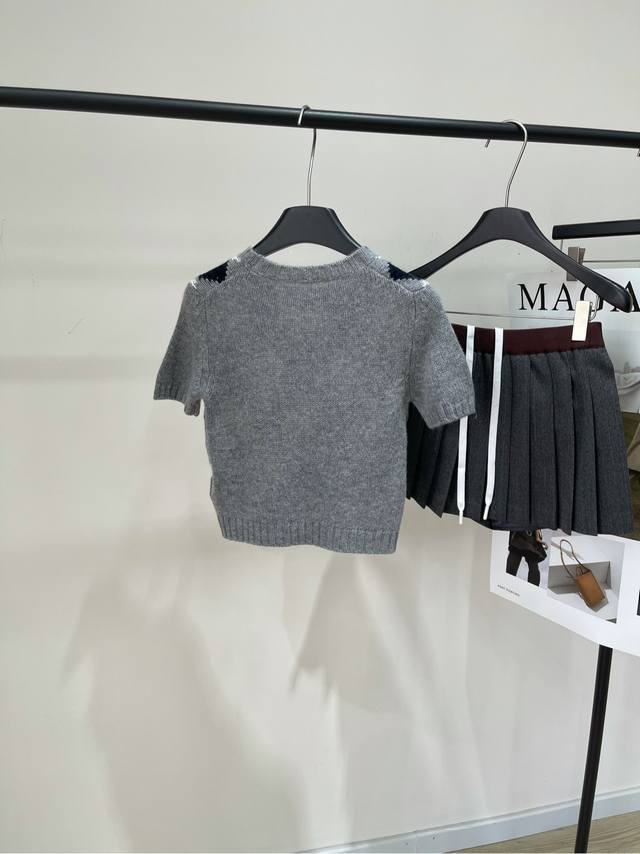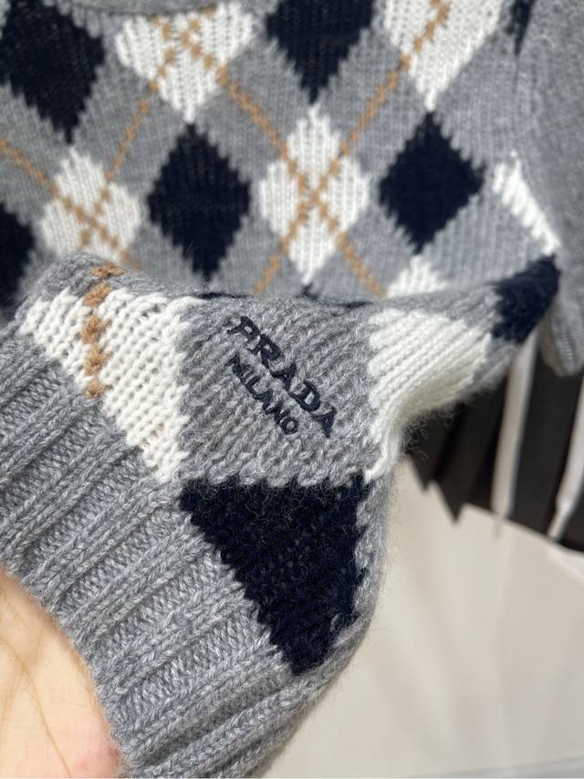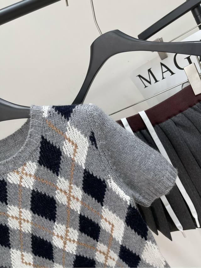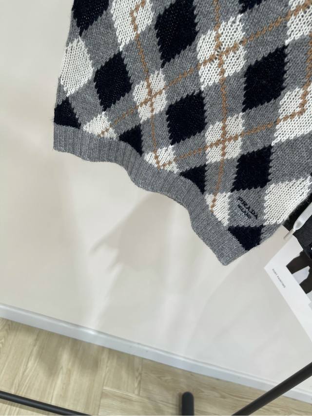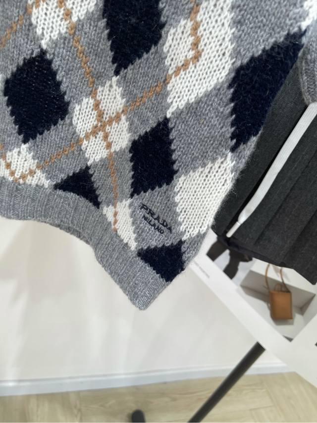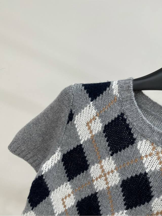 P Grey checkered cashmere knit short-sleeve top. Fabric: Cashmere. Color: Grey checkered. Prad* 25Fw Early Fall new arrival: Colorblocked diamond-patterned logo-embroidered short-sleeved top. High-quality