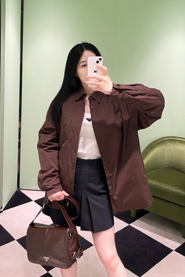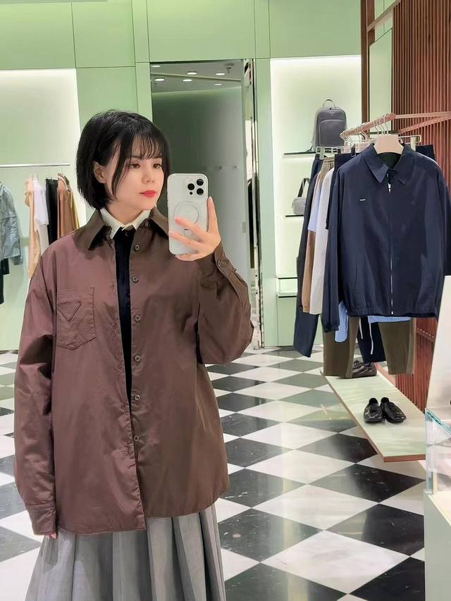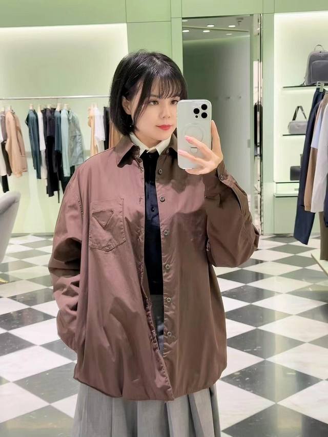 Prad* 25Fw Early Fall new solid-color, lightweight padded jacket | Exclusive Yb development! High-top version! This jacket features a flared collar and a loose, dropped shoulder hem with a loose, hemmed design. The mid-length silhouette creates a neutral, handsome boyfriend vibe. The triangular fabric label on the chest pocket further highlights the brand's refined aesthetic. A perfect outer layer for the transition from fall to winter. Easy to style for a relaxed, fashionable look. Available now: S, M, L, D, D.