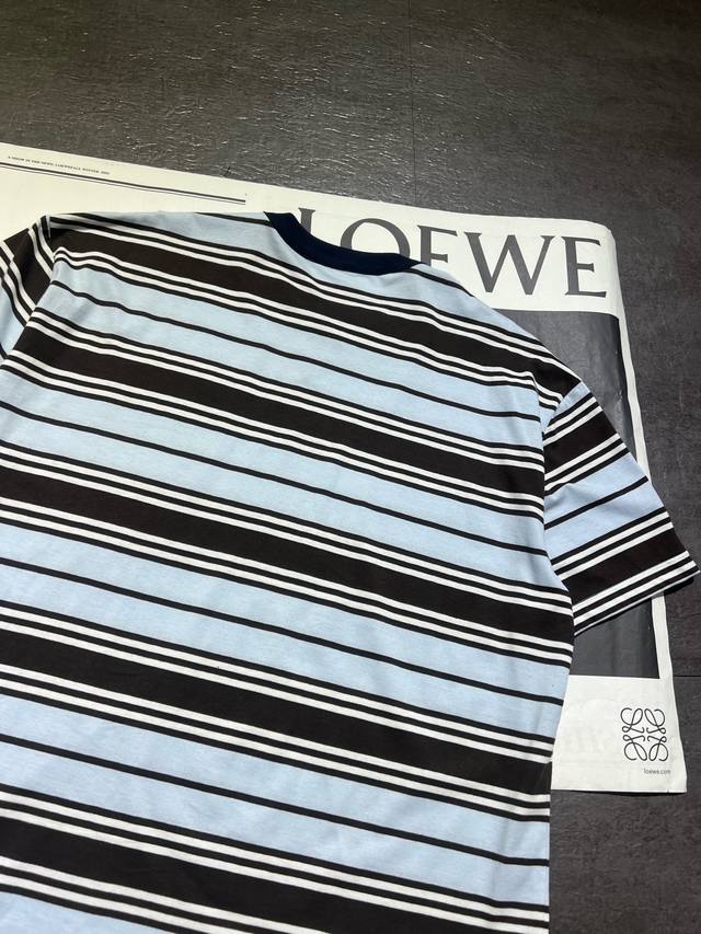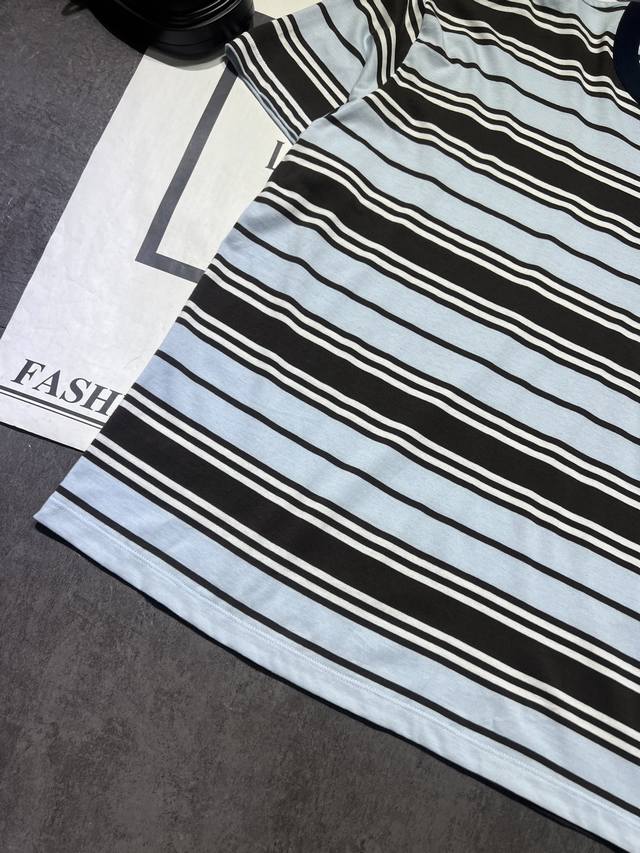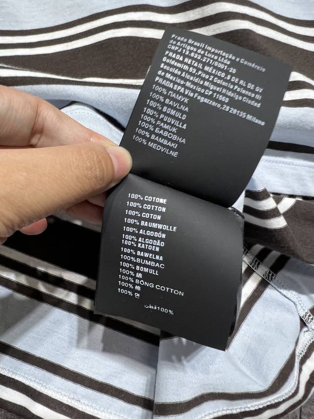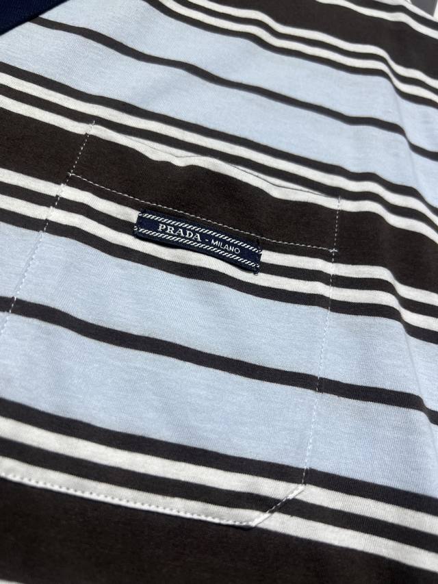 Prad* New mint chocolate striped short-sleeved round neck T-shirt | Exclusive Yb development! High-end production! Super high-end color matching Loose version can be worn by couples Simple and high-end not picky P-body chest pocket and label design Workmanship quality depends on details. Available now SML