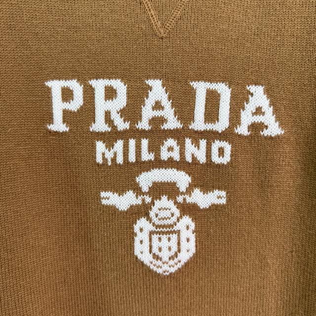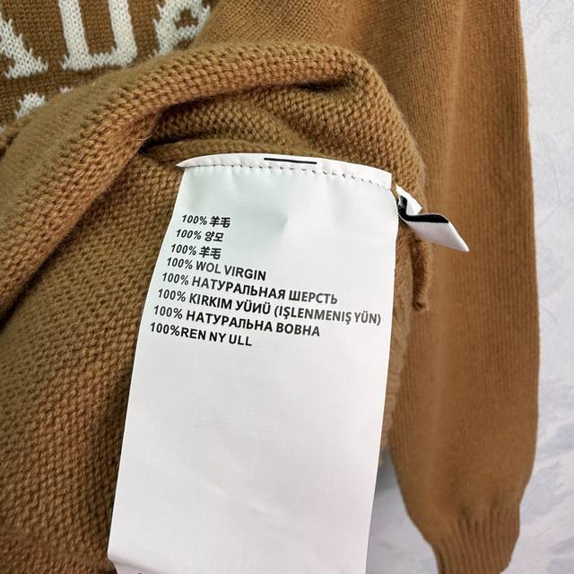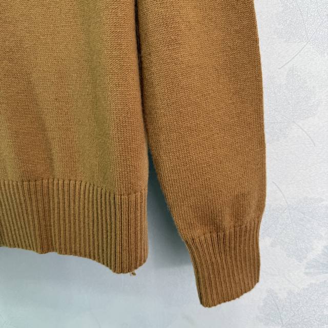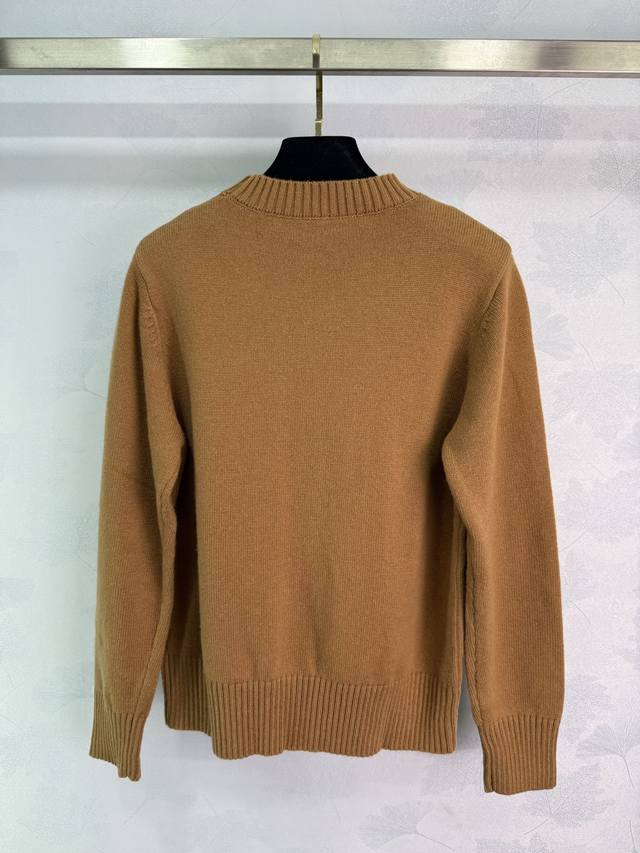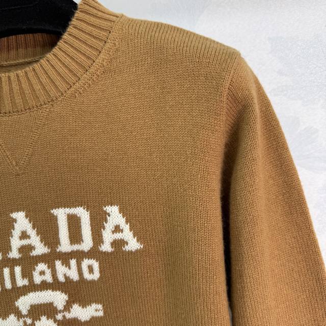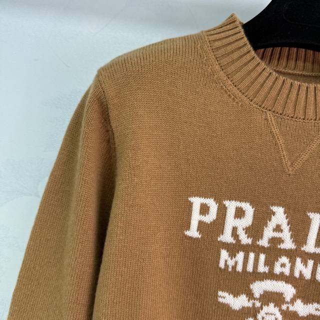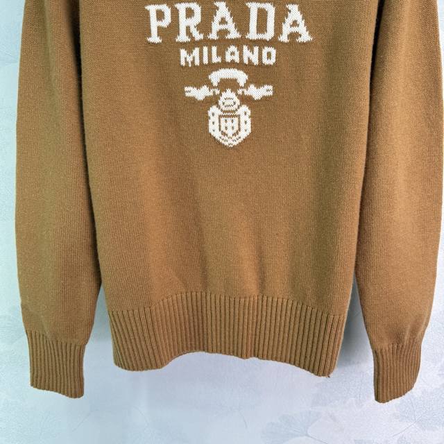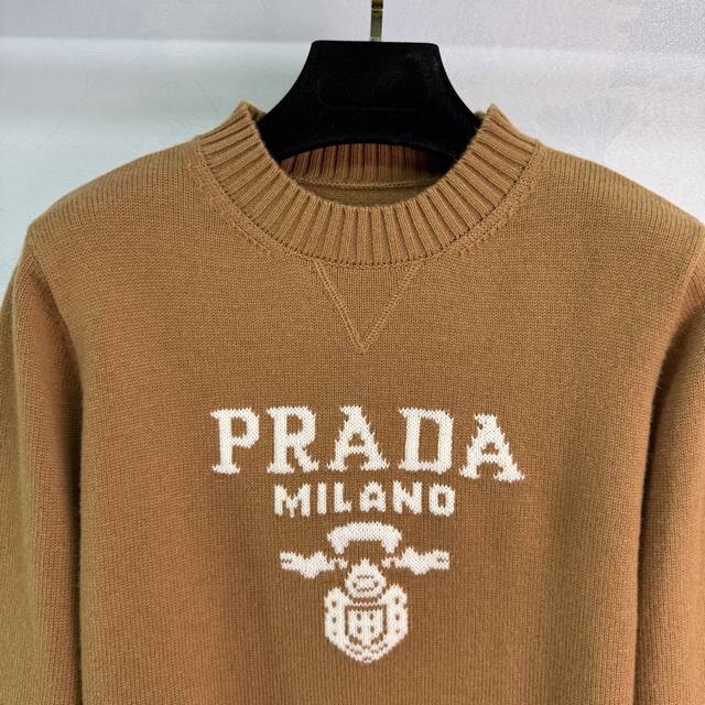 Prad*2025 Autumn/Winter New Logo Loose Pullover Sweater, Custom Yb Cashmere and Wool Yarn, High-Quality, Comfortable and Soft, Round Neck, Drop Shoulder, Long Sleeve Sweater. Ribbed edges on the neckline and cuffs, floral letter logo and shield decoration on the chest highlight the brand's style. Loose fit, flattering for all body types and ages. Plain knit ribbed knit, timeless and stylish, making the outfit more sophisticated and relaxed. A simple and versatile everyday style for autumn and winter! 1 color, 3 sizes: S, M, L, T2, 26, B,
