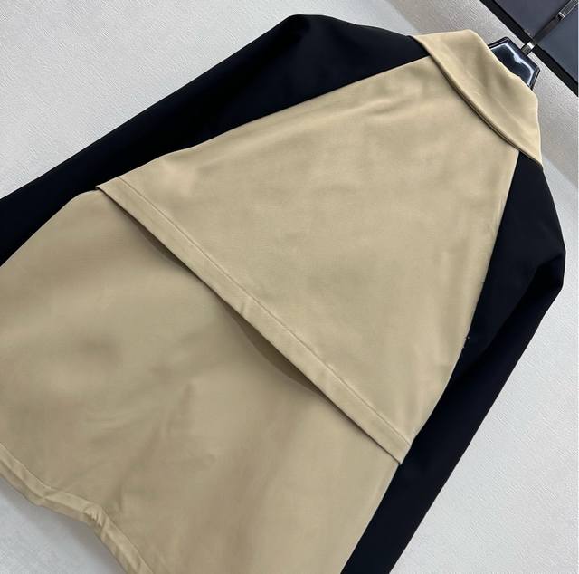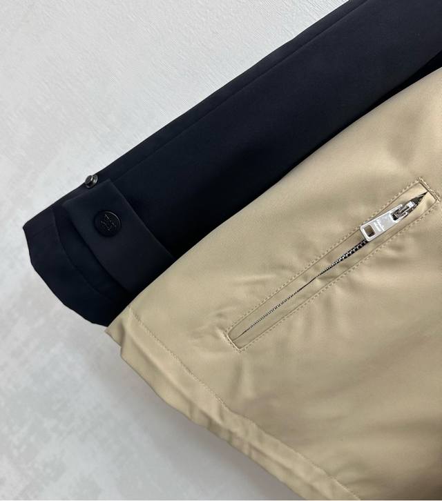 Prad*2025 New Arrival: Color-blocked Jacket, Custom Made with Imported Twill Cotton, Crisp, Comfortable, and Stylish. Light khaki body with black trim on sleeves adds depth to the look. Suitable for autumn and winter, perfect for casual wear. The iconic metal triangle logo on the chest highlights the brand's style. Features include a dropped shoulder and lapel collar. The cut presents a casual, preppy, and sophisticated old-money style. High-quality