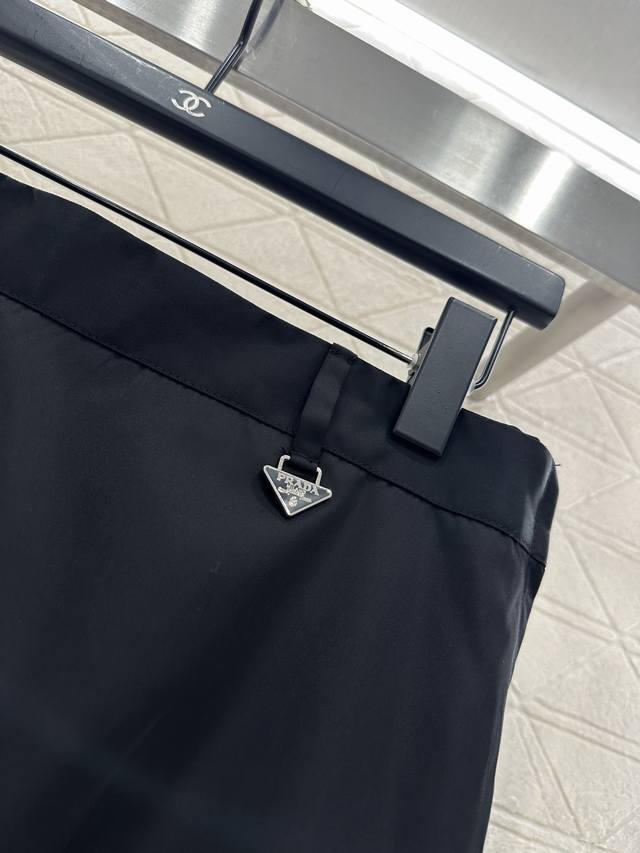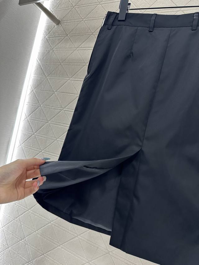 Custom Made with imported eco-friendly recycled nylon, it boasts a comfortable sheen, a crisp and stylish look, and a high-waisted silhouette. Features a side zipper slit, a straight, fitted waist and hips, and a knee-length skirt with a slit, flattering the figure and highlighting long legs. Details showcase the brand's style, and a triangular logo pendant at the waist adds a touch of sophistication, style, and youthful charm. Suitable for all seasons. Custom fabrics and accessories, look for the high-quality version