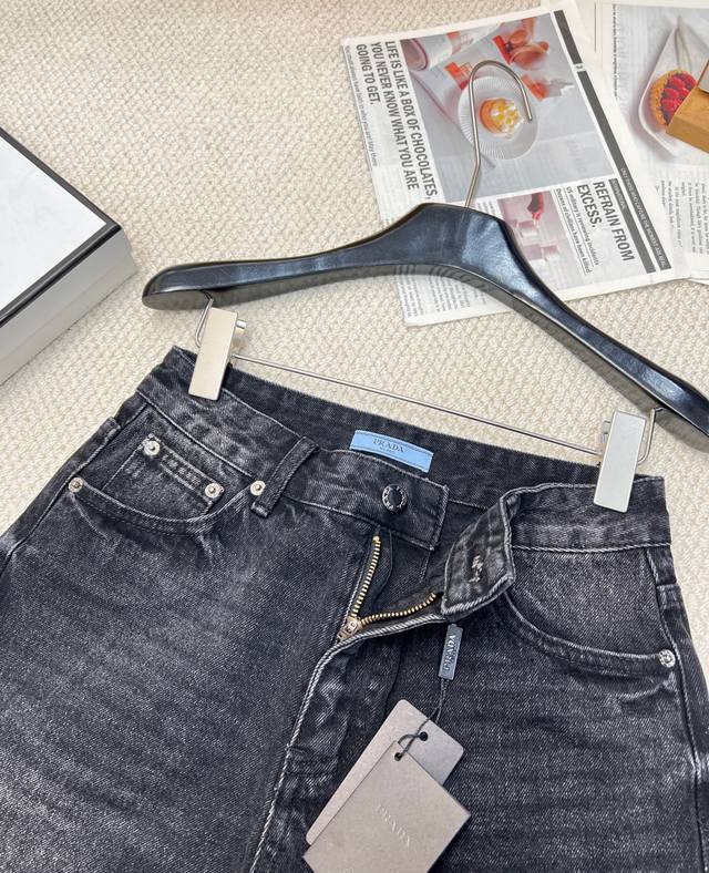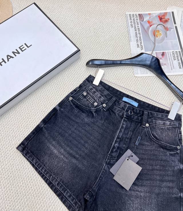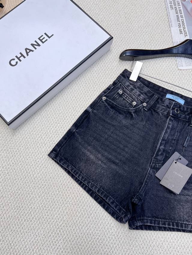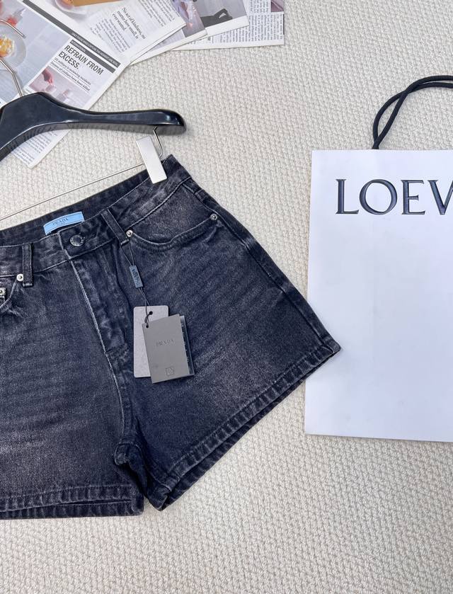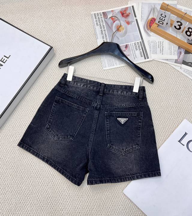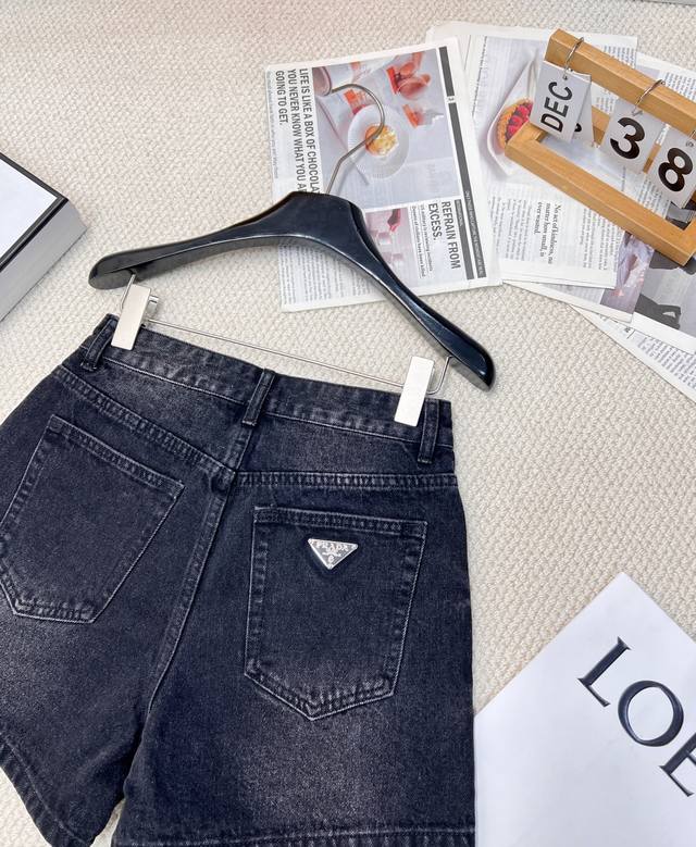 Prada classic triangle logo high waist denim washed denim shorts, high waist A version design makes the legs look longer and easy to match. The retro triangle logo design on the back adds a sense of luxury. The fabric is soft and smooth and very comfortable.