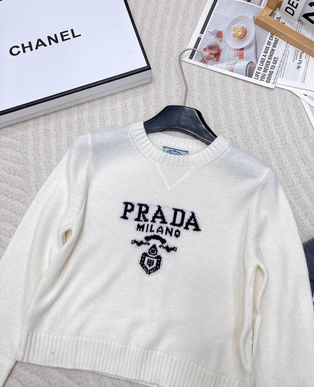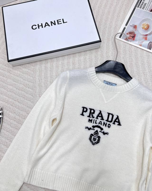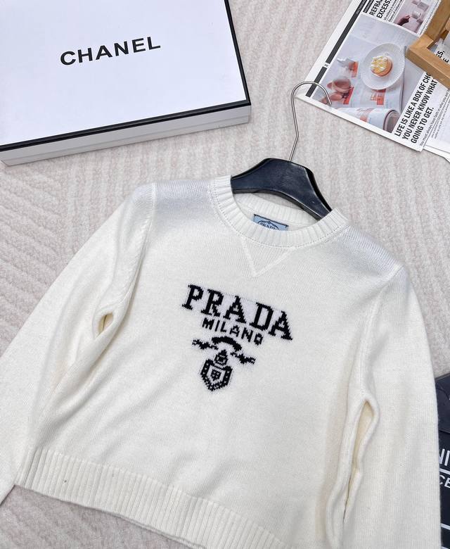 prada24Ss Prada early spring new letter logo sweater, classic and super comfortable to wear, the fabric is incredibly soft! The short style is very slimming and makes you look petite. The letter design on the chest adds detail. The ribbed hem provides excellent warmth. It looks great with pants and skirts. The loose fit suits all body types. A versatile piece. Bulk orders are now available! Sizes S, M, L, Ddd. Code p. DDD