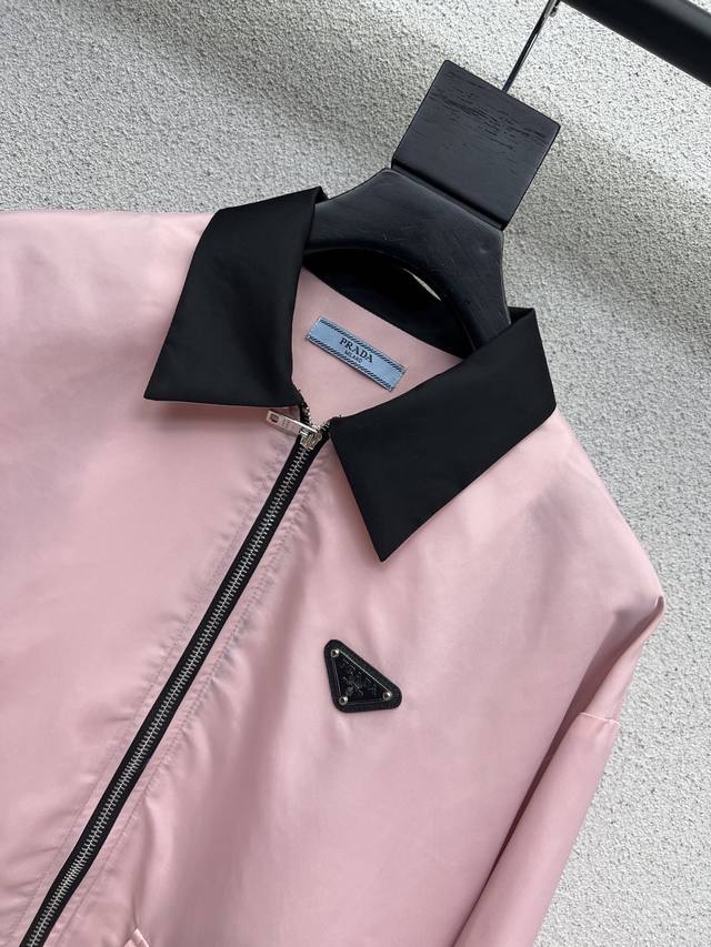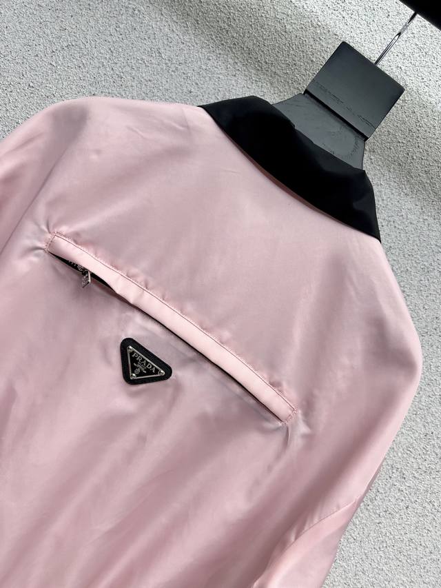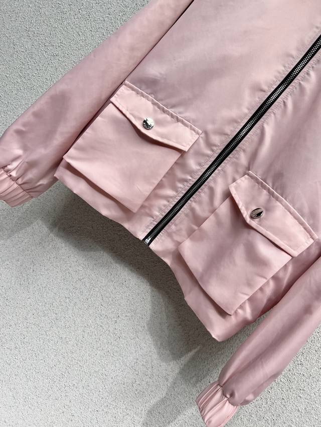 P's pink jacket with a triangle logo and zipper is stylish, understated, and luxurious! The versatile fit is perfect for everyone, and the workmanship is exquisitely detailed. A must-have for beautiful women! Highly recommended for its high quality. Sizes Sml.