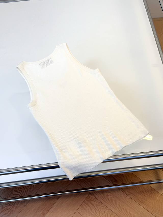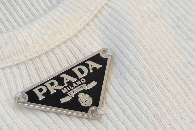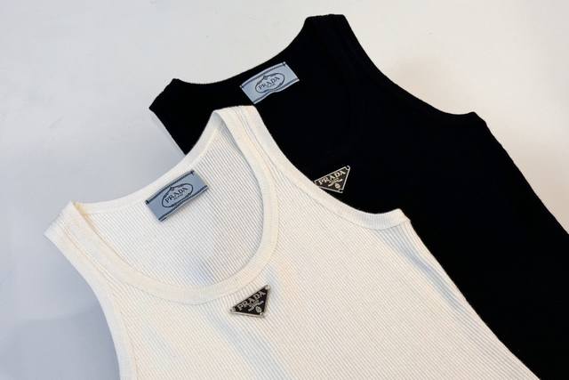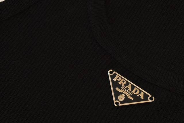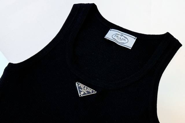 This triangle logo vest exudes understated elegance and a minimalist design, reflecting Prada's consistent design philosophy. The fitted silhouette embodies the brand's core philosophy of understated luxury. The striking triangle logo adorns the front. The vest is made of ribbed knit fabric, offering excellent body coverage. Pair it with a white shirt for a sophisticated look. Available in two colors and three sizes.