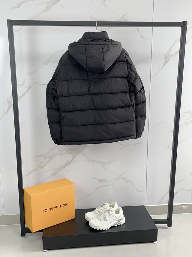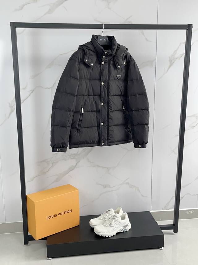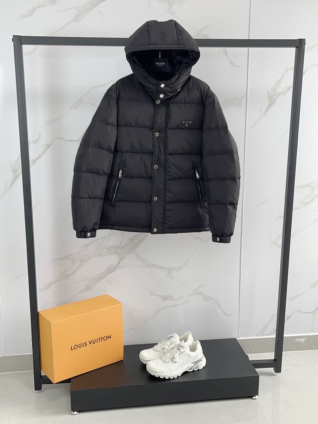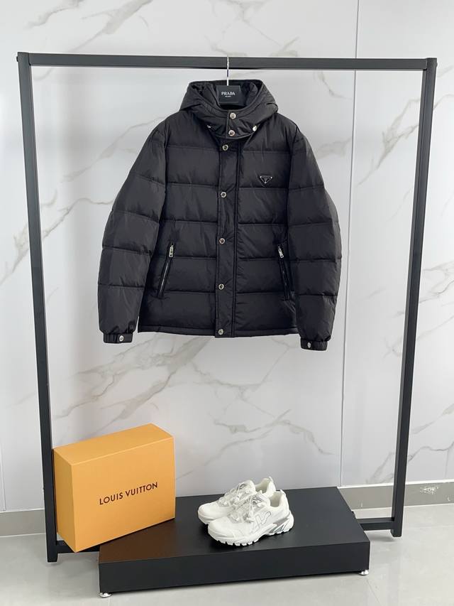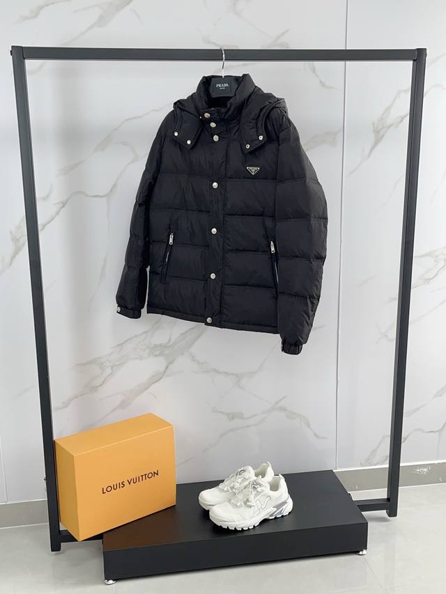 2025 Prada's new fall/winter 2025 hooded down jacket features a detachable hood for lightweight, fluffy warmth and comfort. This classic, versatile down jacket boasts authentic quality. A wardrobe essential, it's incredibly versatile and stylish, exuding a modern, vibrant vibe. Lightweight and warm, it exudes a refined, upscale feel, while also boasting a versatile, high-street flair. Highly detailed with a premium filling of 90% duck down and 10% feathers, it features a triangular chest logo badge. This simple yet stylish piece boasts a fitted silhouette, making it both basic and comfortable, perfectly capturing a casual vibe. Maintaining its signature lightweight qualities, the fabric is crisp and high-density, making it highly windproof for fall and winter. The down-resistant lining provides exceptional comfort, and even the smallest details reflect the meticulous design. All custom-made trims are finished with smooth, even seams, resulting in exquisite workmanship.