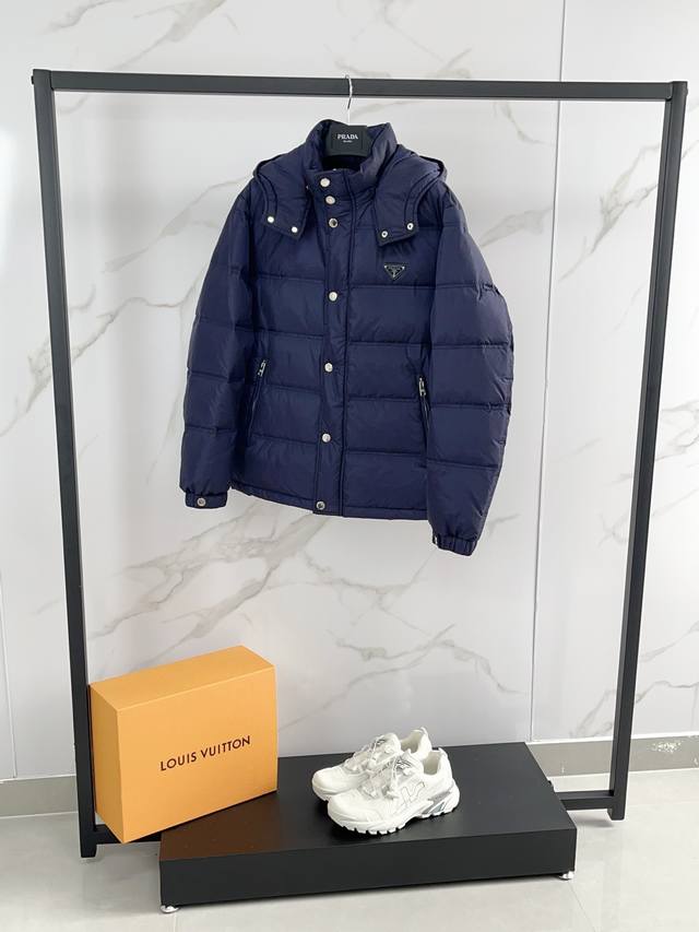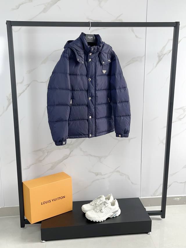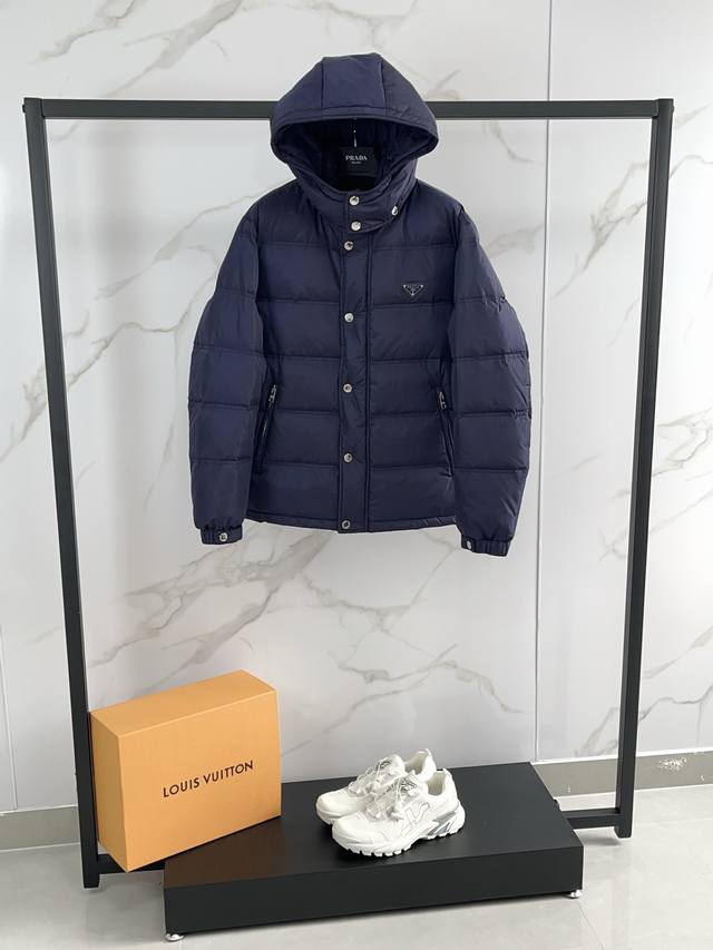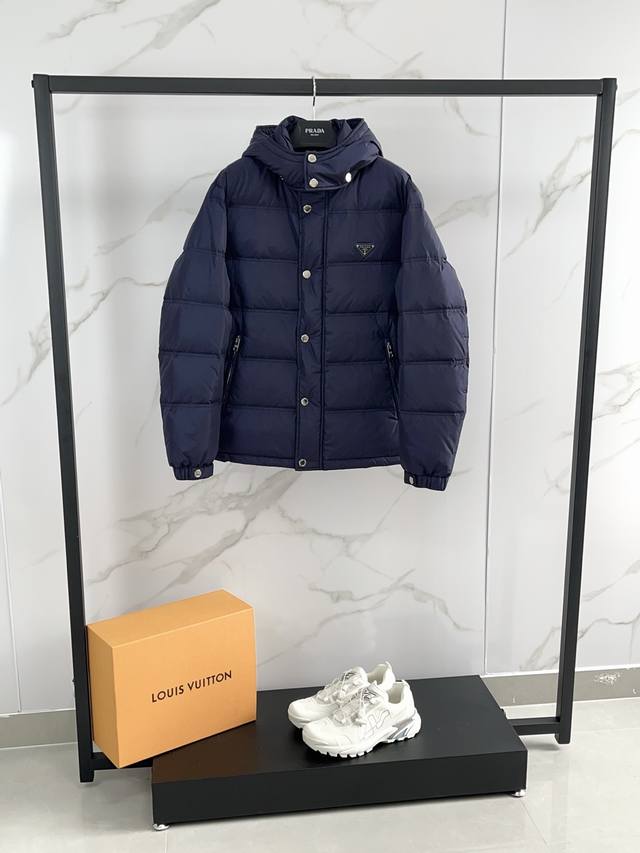 2025 Prada's new fall/winter 25 hooded down jacket features a detachable hood for lightweight, fluffy warmth and comfort. This classic, versatile down jacket boasts authentic quality. A wardrobe essential, it's incredibly versatile and stylish, exuding a modern, vibrant vibe. Lightweight and warm, it exudes a refined, upscale feel, while also boasting a versatile, high-street flair. Highly detailed with a premium filling of 90% duck down and 10% feathers, it features a triangular chest logo badge. This simple yet stylish piece boasts a fitted silhouette, making it both basic and comfortable, perfectly capturing a casual vibe. Maintaining its signature lightweight qualities, the fabric is crisp and high-density, making it highly windproof for fall and winter. The down-resistant lining provides exceptional comfort, and even the smallest details reflect the meticulous design. All trims are custom-made, with smooth, flattering seams and exquisite workmanship.