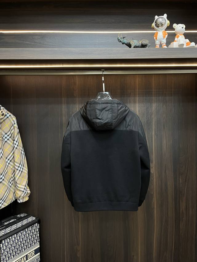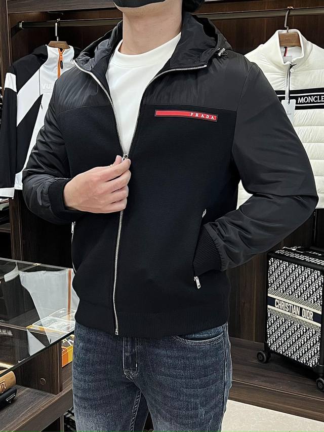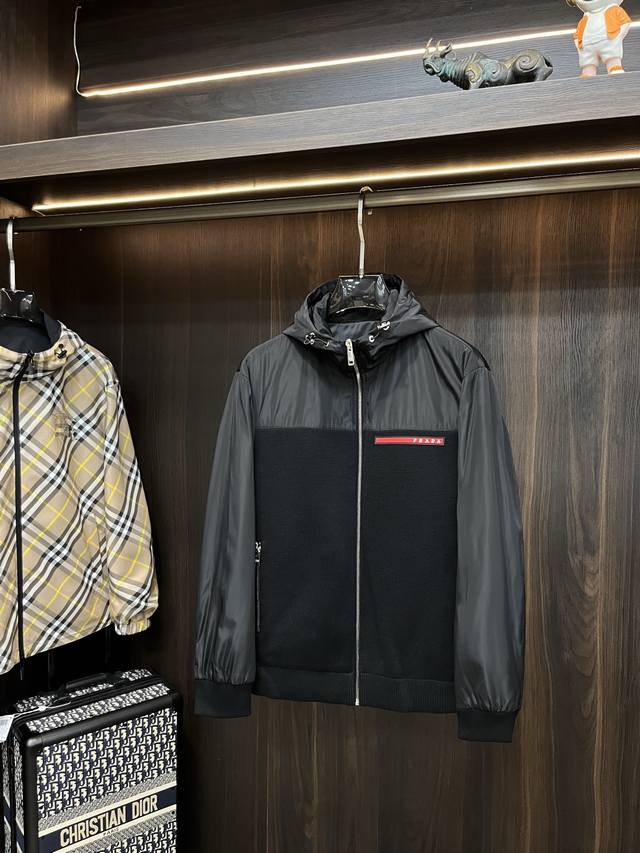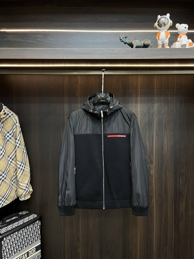 Featured: Prada's new 2025 Early Fall collection. This Prada hooded jacket features a patchwork fabric and a thin, padded design, making it a popular fall item. The jacket features a red rubberized logo print. It's comfortable, slimming, and effortlessly casual. Combined with clean, simple colors, it's a great look for everyday wear. We're featuring sporty pieces embellished with vibrant prints! Sizes: M-3Xl. All three labels are complete and shipped the next day. Color: Black. H2025 new release, Fhs