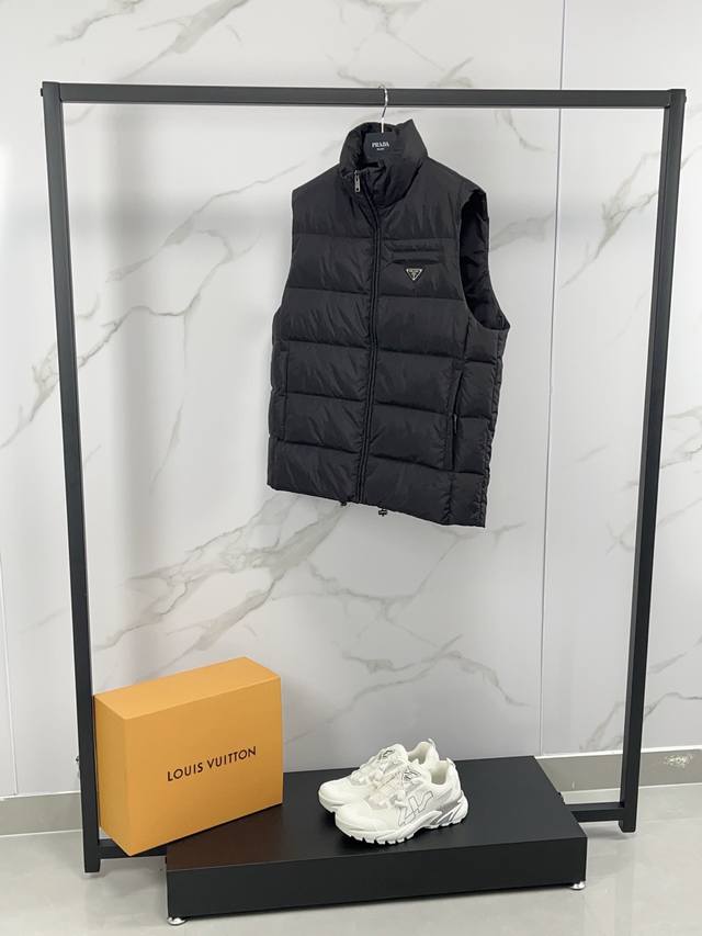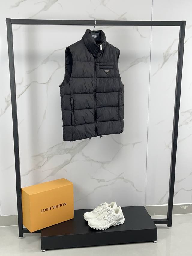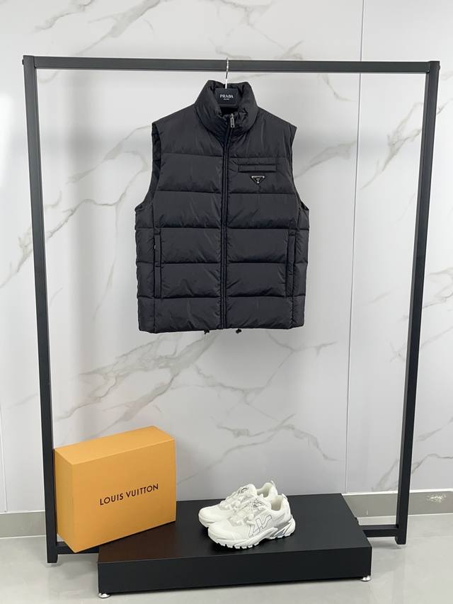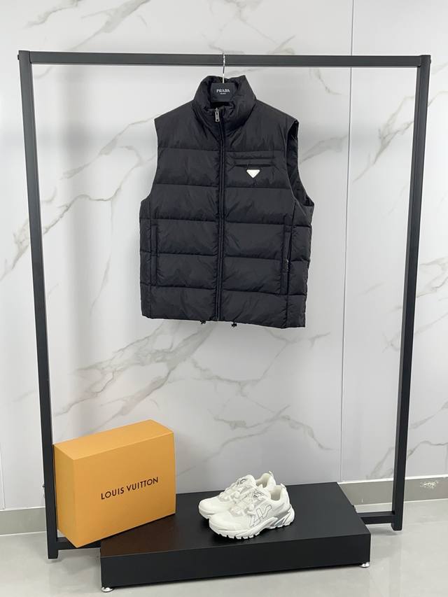 New arrival! Prada's new fall/winter 25 down vest features a classic stand-up c