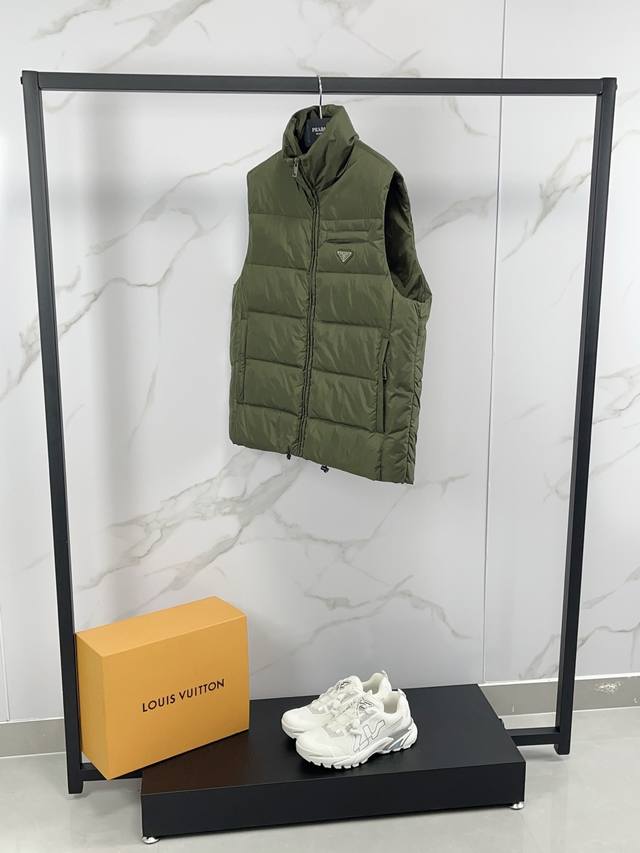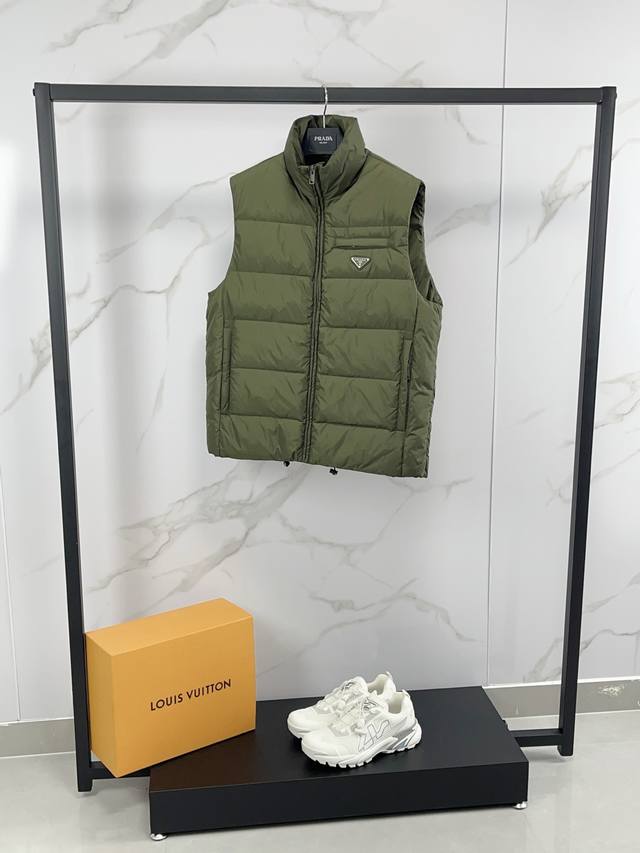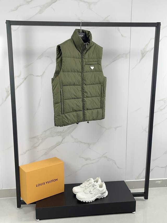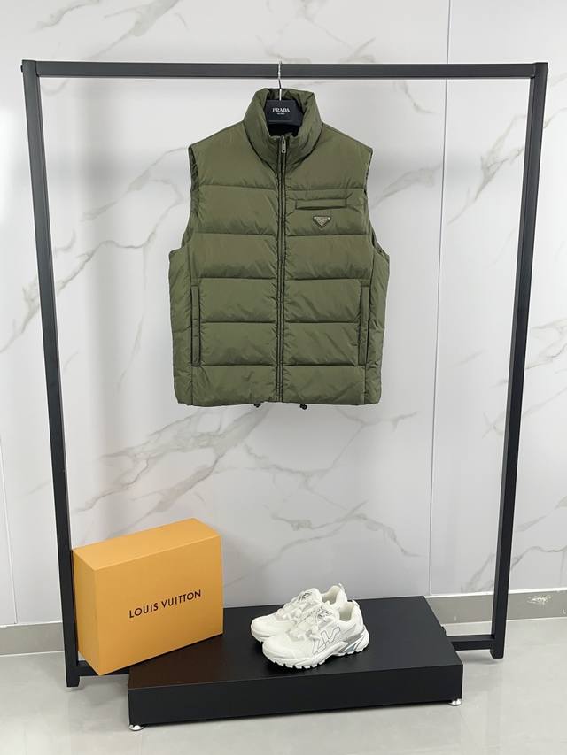 New arrival! Prada's new fall/winter 25 down vest features a classic stand-up c
