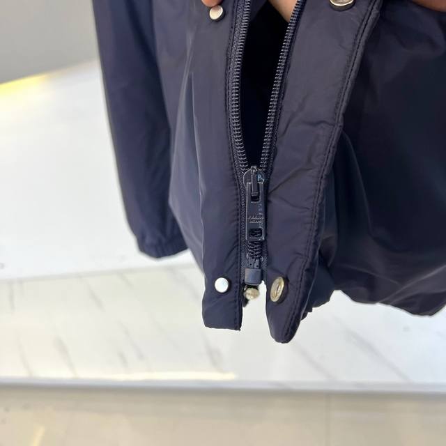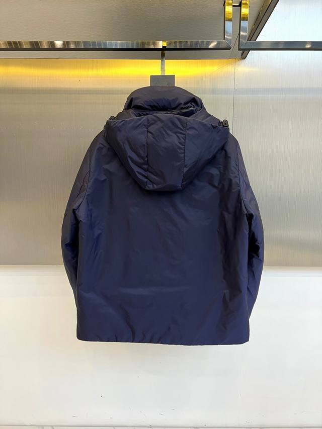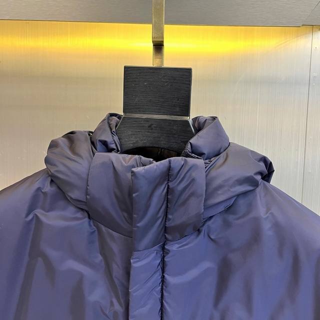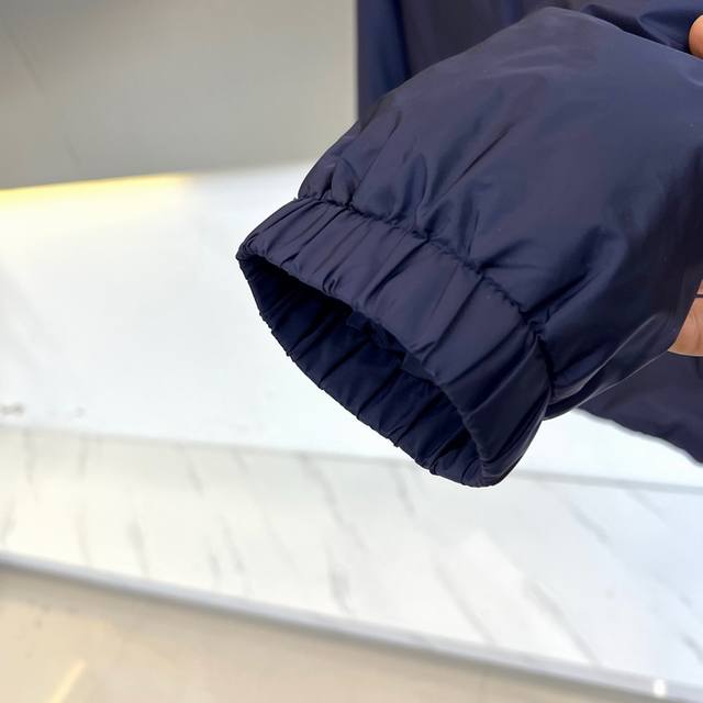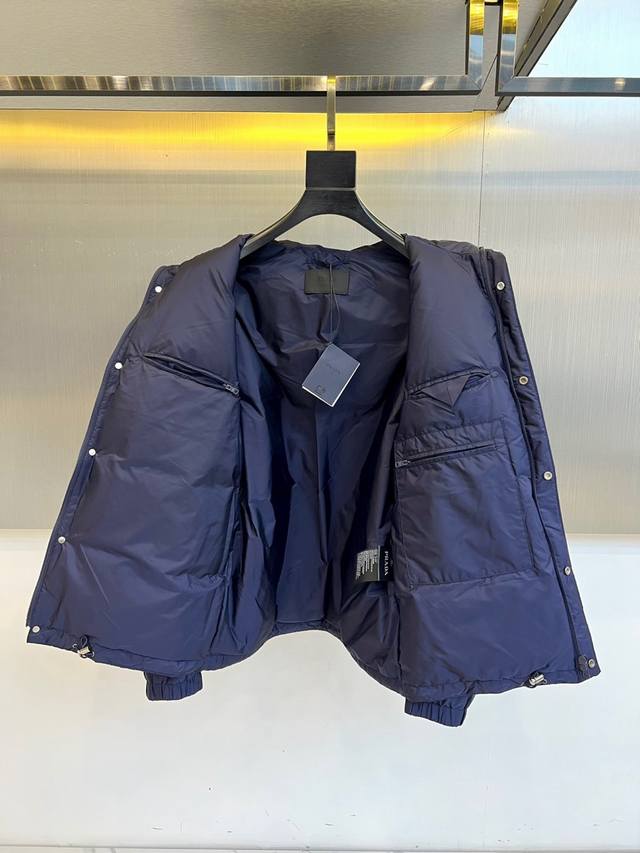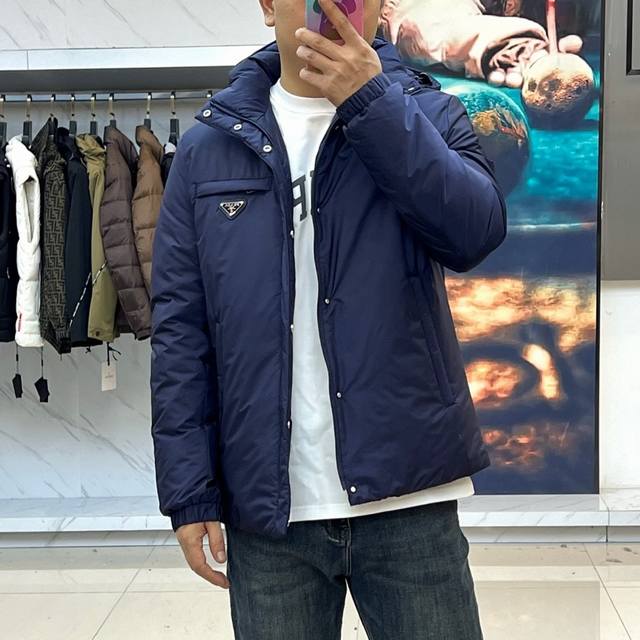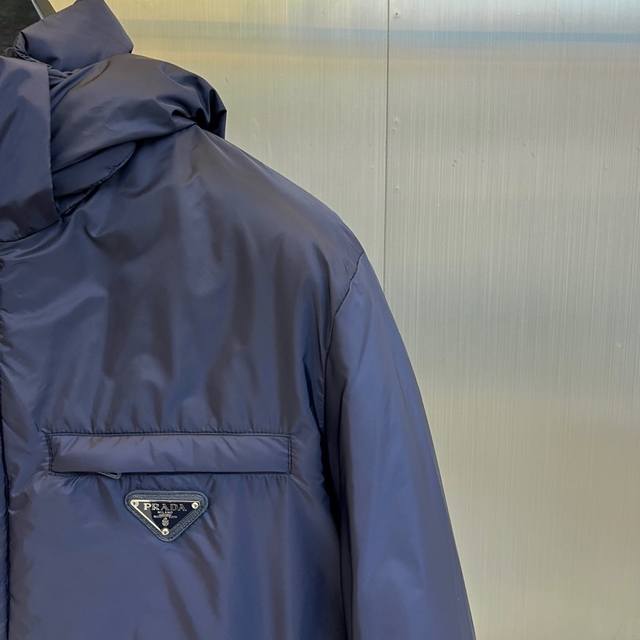 Prad, 2025 Fall/Winter New Down Jacket. This hooded down jacket features a three-dimensional tailoring process, a smooth metal zipper closure on the front, and the brand's iconic triangular enamel logo on the left chest. Slanted side pockets are precisely angled into the body lines, and elastic ribbed cuffs enhance wind protection. Made from 100% polyester and filled with eco-friendly cotton, it provides reliable warmth while maintaining a lightweight feel. The inner label clearly indicates the composition and care instructions, recommending gentle washing at 30