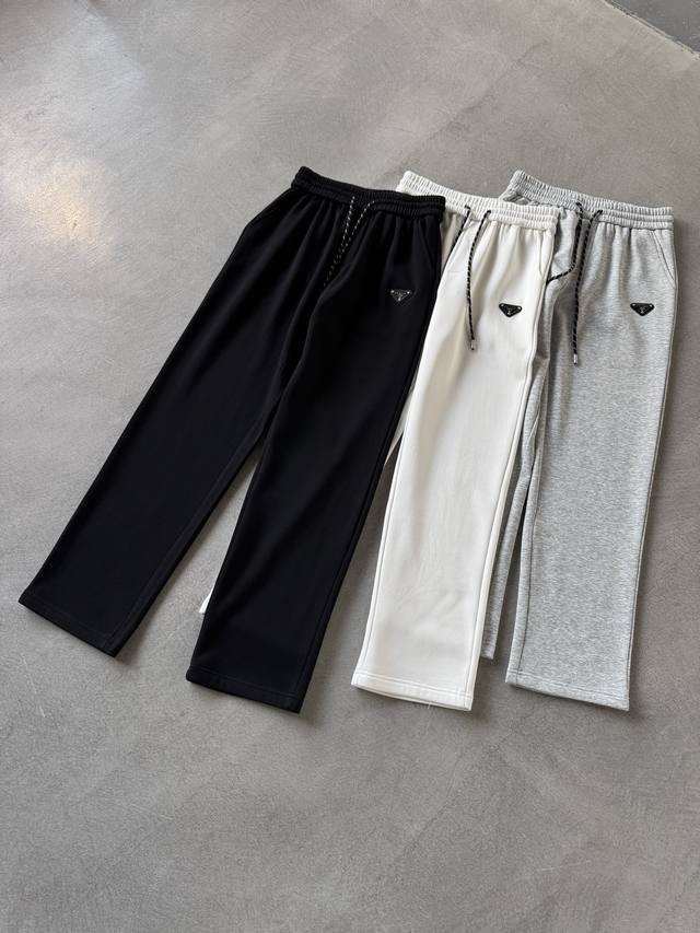 Prada 2025 Autumn/Winter Fleece-Lined Straight-Leg Slightly Wide Fit, Warm and Not Bulky, New Fashionable Straight-Leg Casual Pants. Made from premium pure cotton fleece fabric, warm and comfortable. Features meticulously embroidered logo for a simple and clean look. The fit is flattering on all body types. Custom-made hardware accessories. Exquisite craftsmanship, perfect fit, and excellent overall effect. Straight-leg slightly wide fit!! Colors: Black, Gray, White Sizes: M-3XL