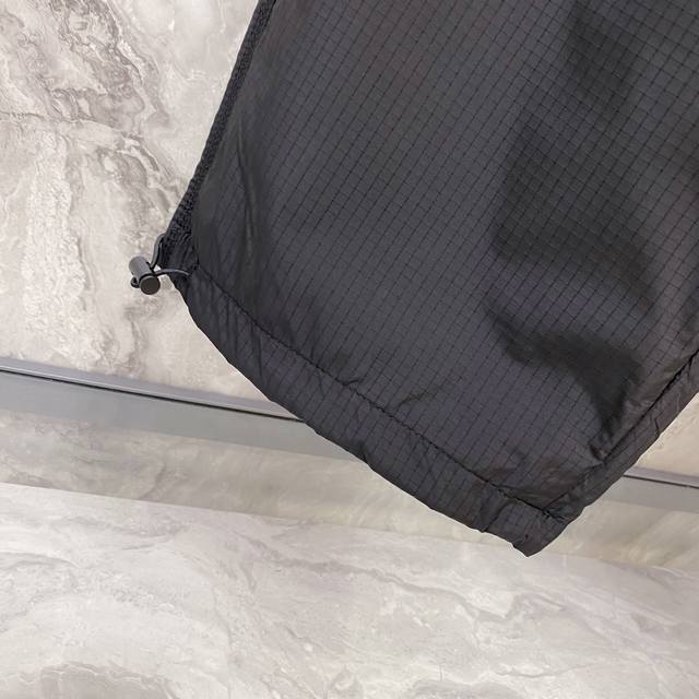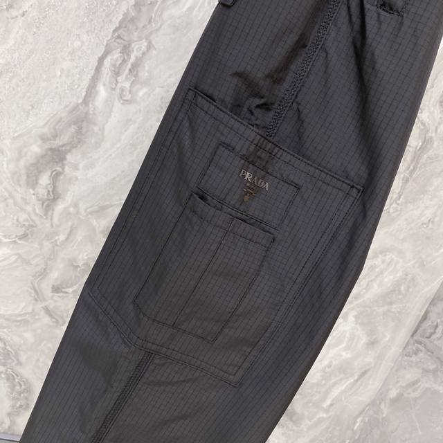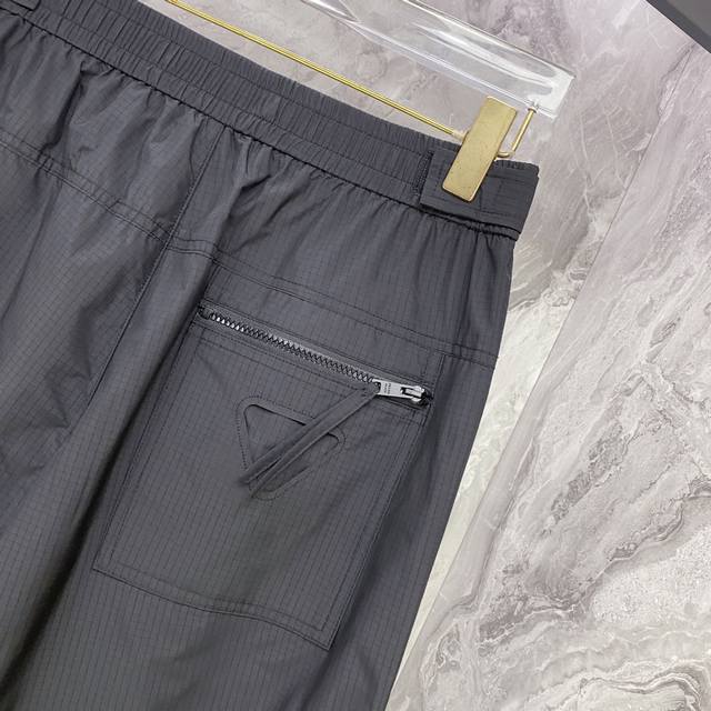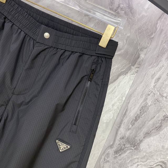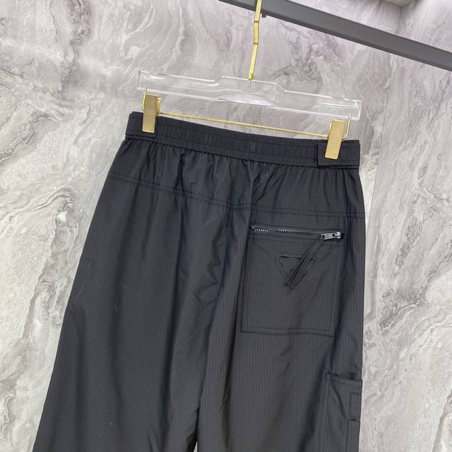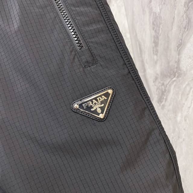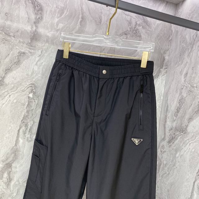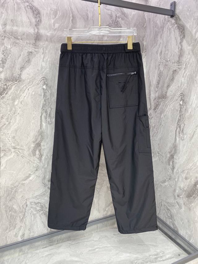 Prada 2025 Fall/Winter New Casual Pants. Custom enamel metal triangle logo casual trousers with an elastic waistband and drawstring. Lightweight and with a beautiful drape, a must-have for all seasons! Color: Black. Sizes: 48-56.