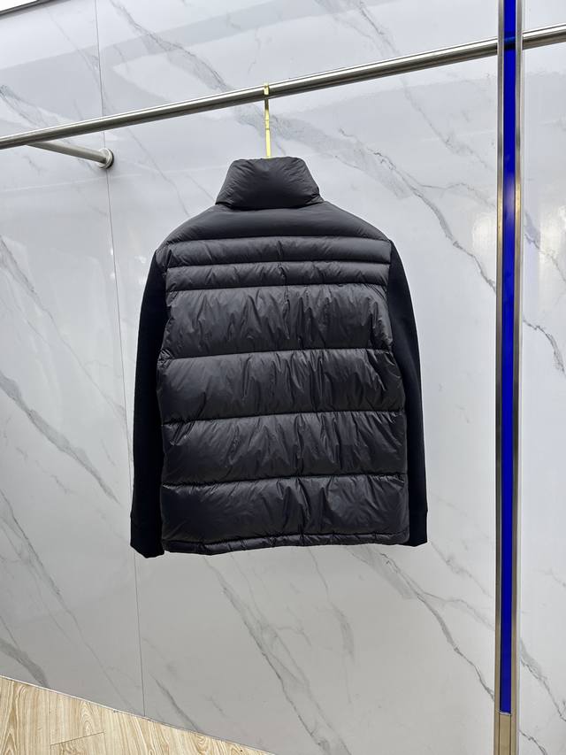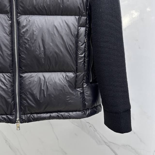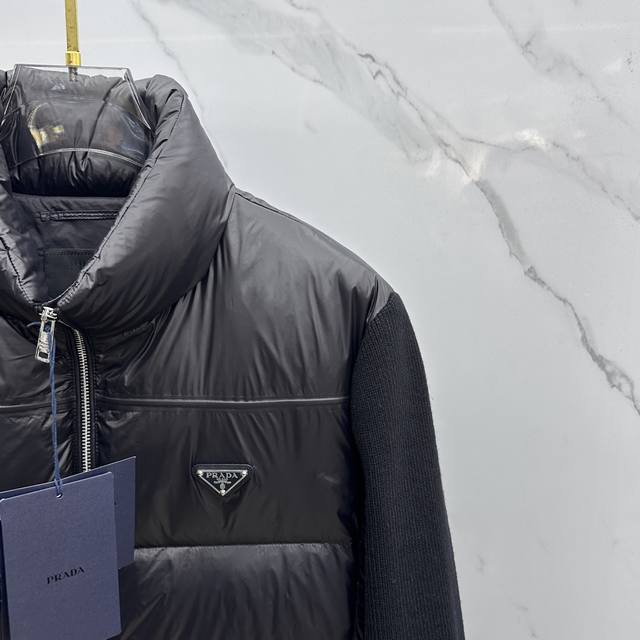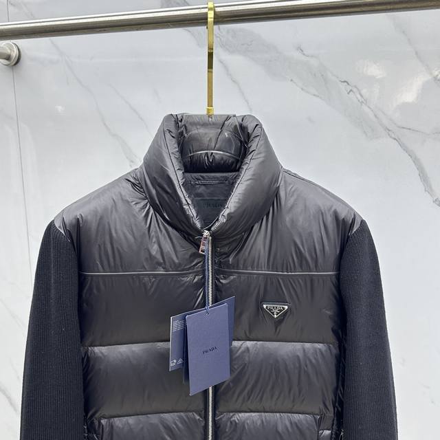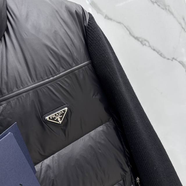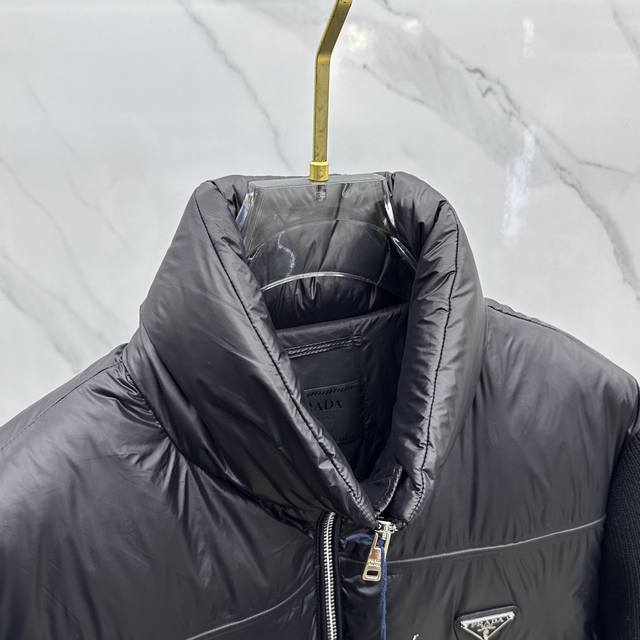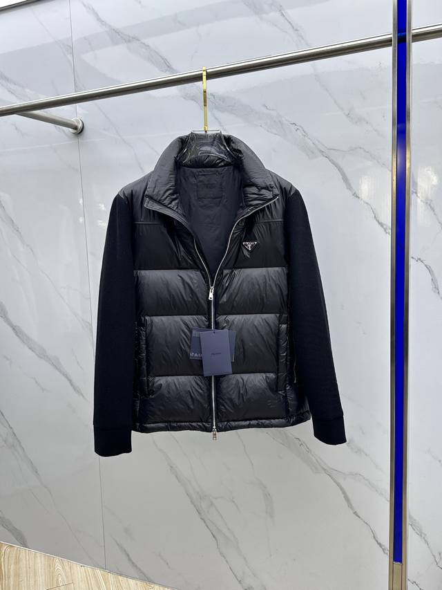 Prada 2025 latest fashionable stand-up collar down jacket, knitted wool patchwork, top-selling winter down jacket, filled with 90# white duck down, every detail shows the craftsmanship of the high-end structural tailoring design to showcase the diverse image of men, slim and neat, well-fitting, meeting the current trend of multi-layered dressing, a versatile style for everyday life! 023 Ddd Sizes: 48-56 DDD