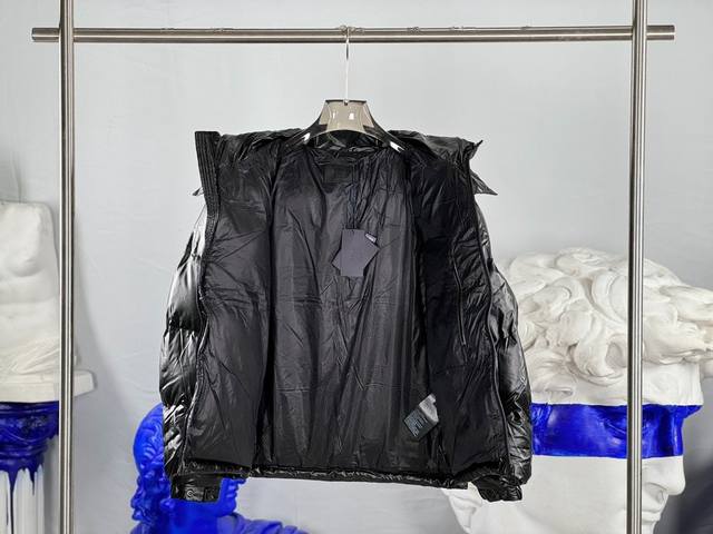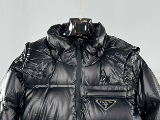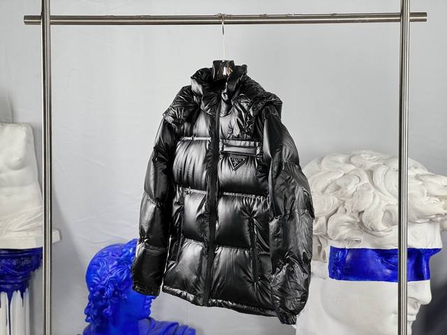 prada classic triangle logo detachable DDD Color: Black DDD Size: 48-56 DDD This full-figured down jacket is crafted from Linea Rossa's unique double-layer lightweight bonded nylon fabric, featuring a hooded collar, straight-cut sleeves, and a front zip closure. Horizontal quilting, details, and an elastic drawstring hem contribute to its distinctive silhouette. The lightweight bonded nylon technology fabric offers windproof, abrasion-resistant, waterproof, and breathable properties, making it a high-tech, multi-functional fabric. The lining is made from finely dense, renewable microfiber fabric, offering a lightweight and soft touch. Goose down and graphene linings help regulate body temperature, adding functionality, while duck down gives the lining filling a lighter feel and enhanced insulation. DDD