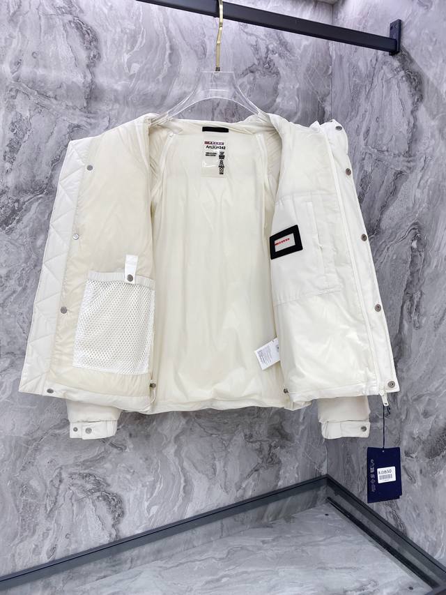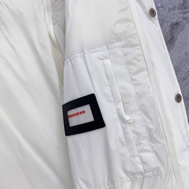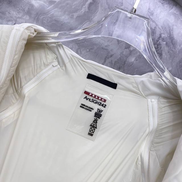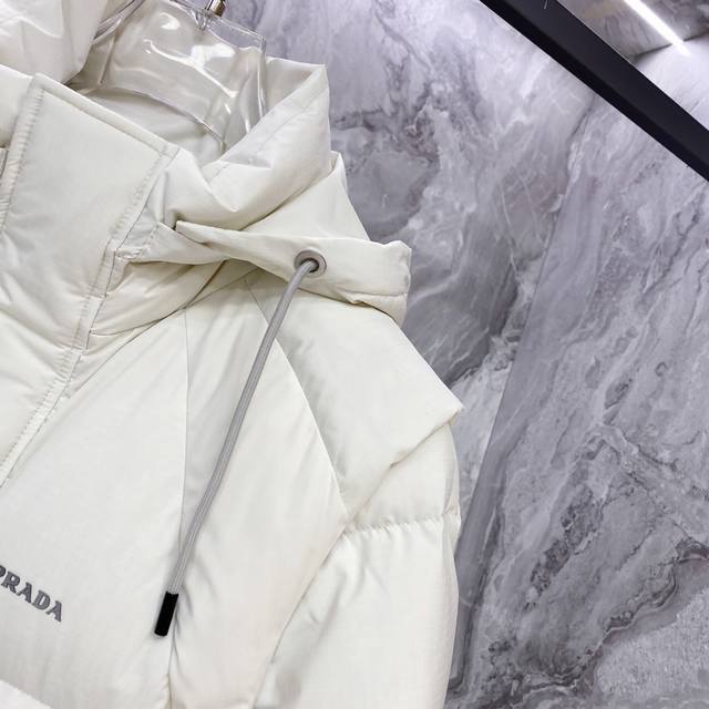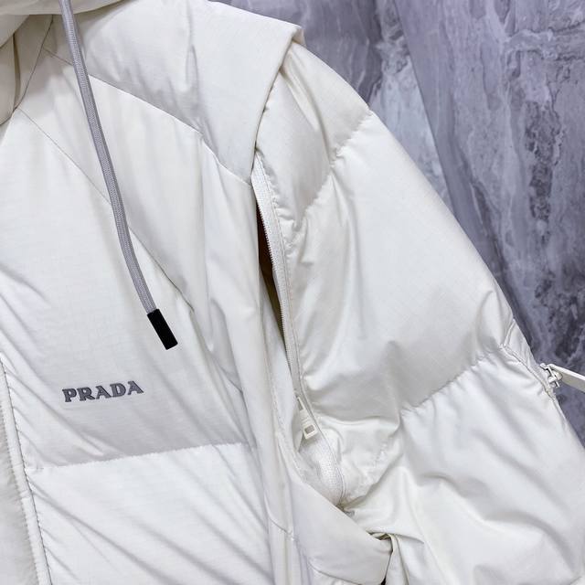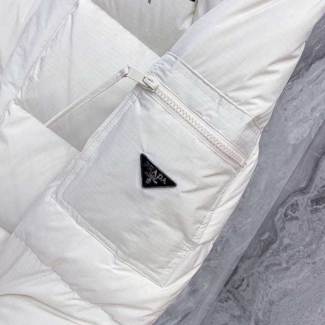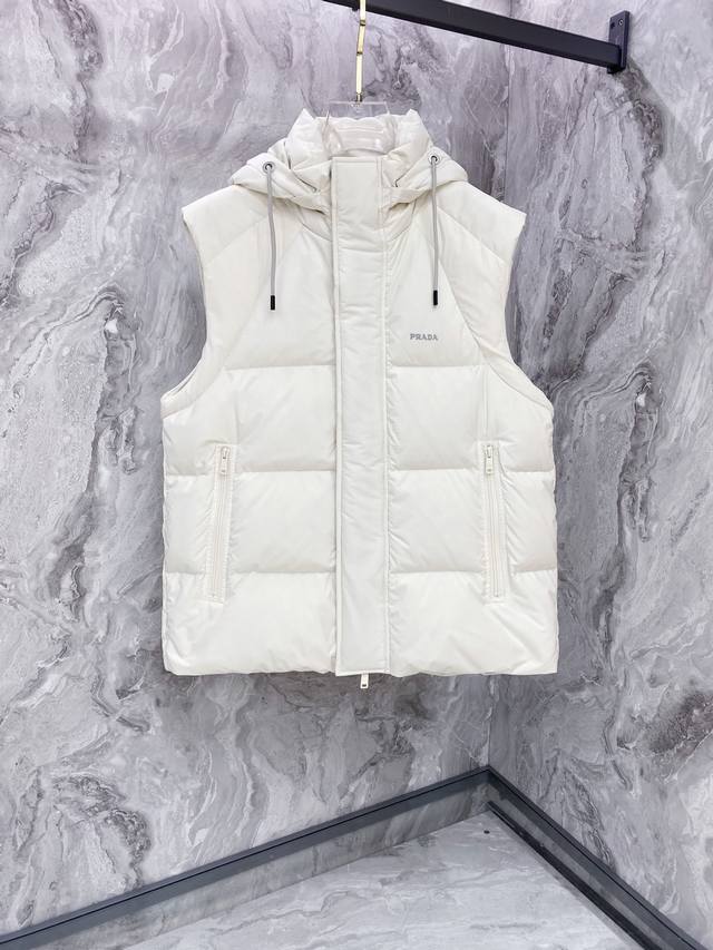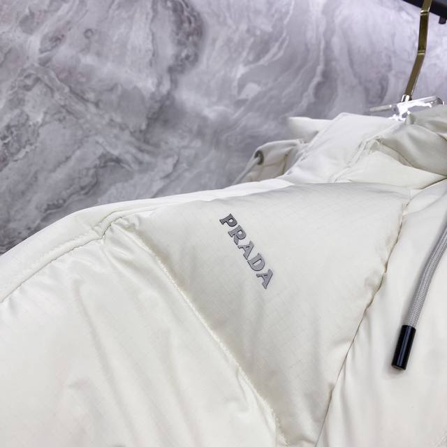 Prada Down Jacket * 2025 Autumn/Winter New Down Jacket | Prada Detachable Sleeves, Two Ways to Wear, Reshaping Winter Style. Made with select 9010 high-quality large-fluff white duck down, with a down content of up to 90%, it's lightweight, warm, and fearless in the face of severe cold. The exterior features a three-dimensional irregular fabric patchwork design, constructing a modern diamond geometric pattern that breaks away from conventional monotony and showcases structural aesthetics. Details are adorned with Prada's classic triangular logo and signature three-dimensional glossy printing, exuding a subtle yet sophisticated sense of identity. The innovative detachable sleeve design allows for easy switching between a jacket and vest, effortlessly adapting to changing temperatures and various occasions. Two ways to wear, combining practicality and modern craftsmanship. Whether for urban daily life or outdoor excursions, it creates an outstanding style. Colors: Black | Off-white. Sizes: M-3XL.