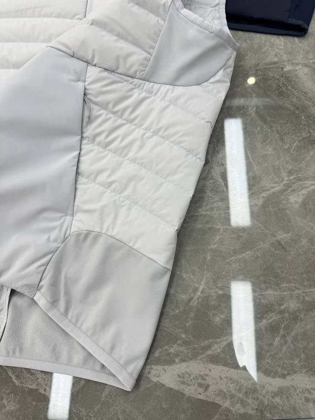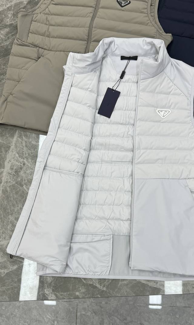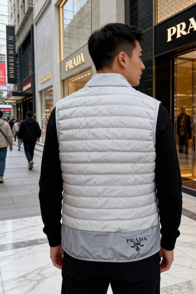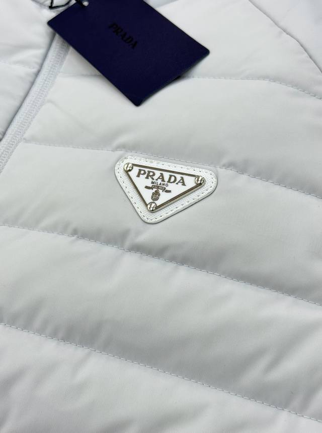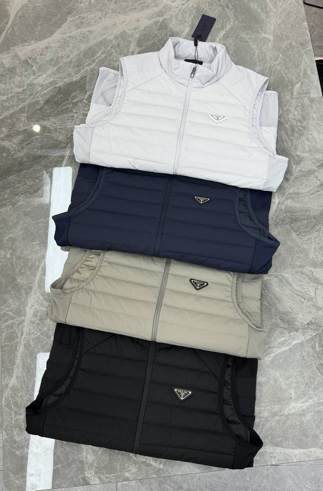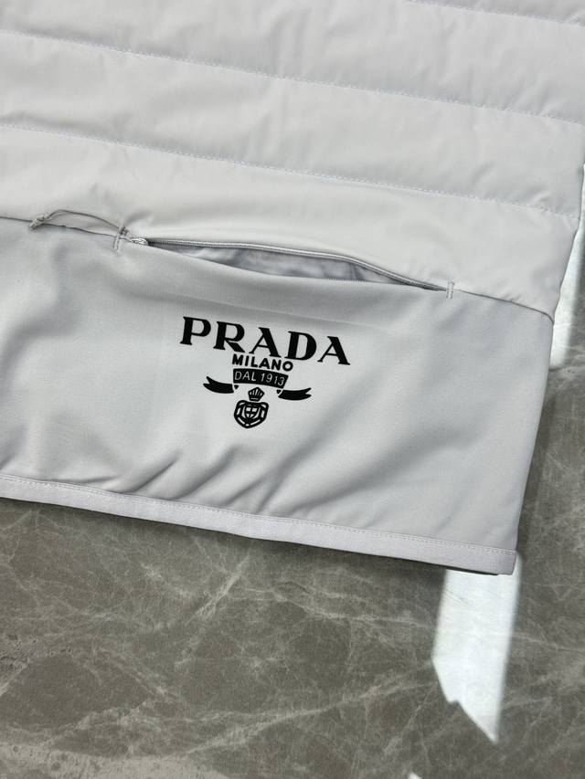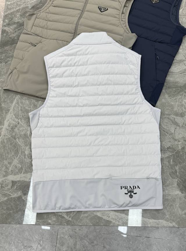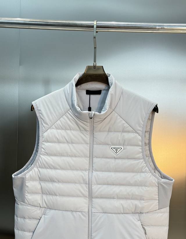 Prada New Down Vest, Prada 25S. This down vest features a simple and clean stand-up collar design! The tailored cut is slim and not bulky. It uses a classic quilted design and is filled with high-quality down, making it lightweight yet warm. The outer layer is made of ripstop nylon, durable and tear-resistant, suitable for daily commutes or outdoor activities. The minimalist style features the Prada logo triangle on the front for high recognizability. It has a concealed zipper at the back hem and multiple pockets with the Prada logo for easy on and off. The zipper design makes it incredibly versatile for layering in autumn and winter, easily adaptable to both casual and business settings. Colors: Black, Blue, Khaki, Light Gray. Sizes: S-2XL. Recommended size: M (for someone 175cm tall and weighing 140kg).