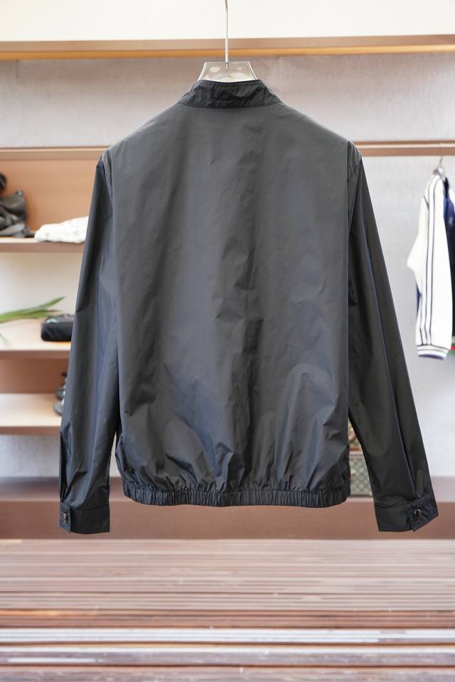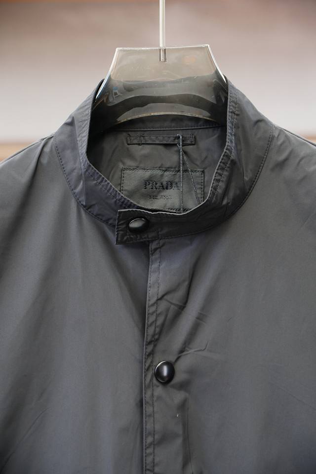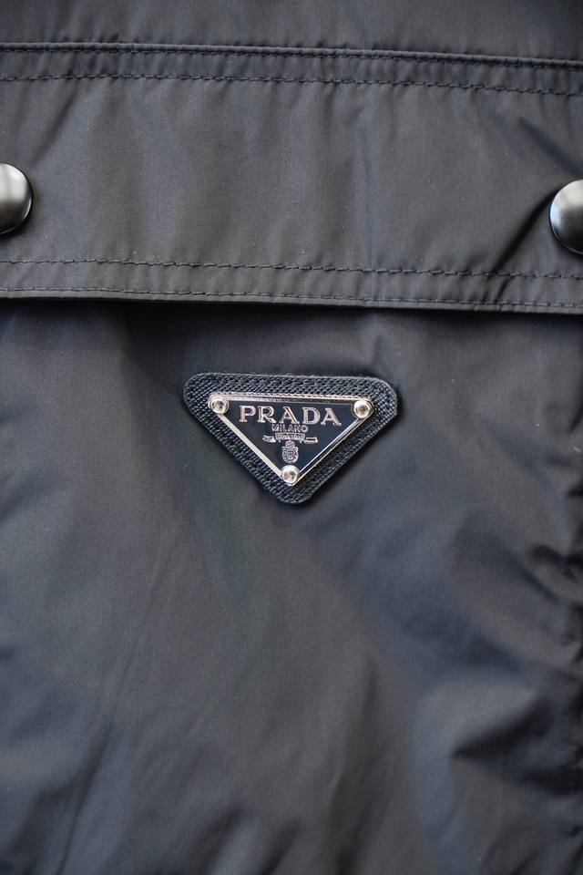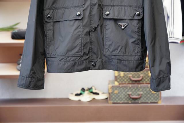 Prada - New Spring/Summer 25 Pr*Da jacket with a metal triangle logo and a small stand-up collar. This lightweight, double-pocket nylon jacket is a men's workwear jacket. Order now at the Shanghai Henglong counter, and it's available on the official website. The simple metal snap fastening and small stand-up collar create a practical and unique style. Made of lightweight nylon fiber, it feels light, tough, and smooth! It exudes a stylish retro vibe!