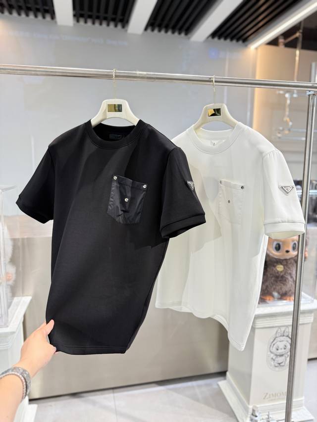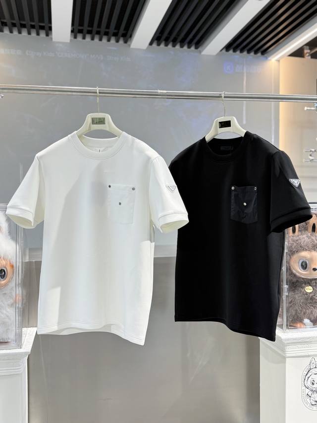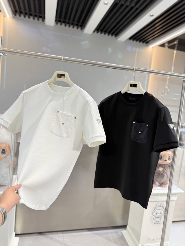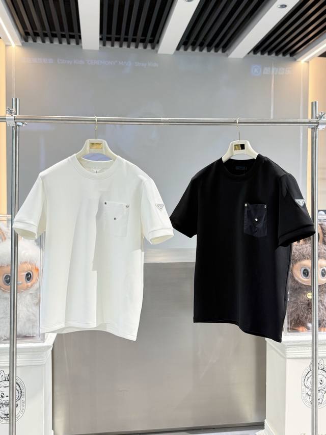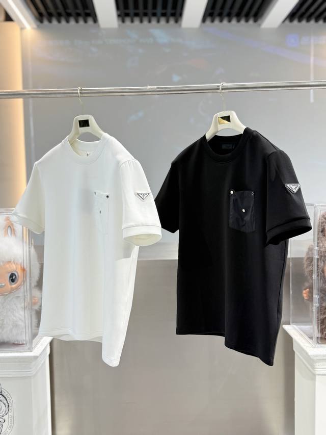 Prada's 2025 Fall/Winter round-neck embroidered short-sleeved T-shirt base shirt features an elemental logo badge that highlights its casual and fashionable charm, maintaining its unique style. A perfect inner wear companion.