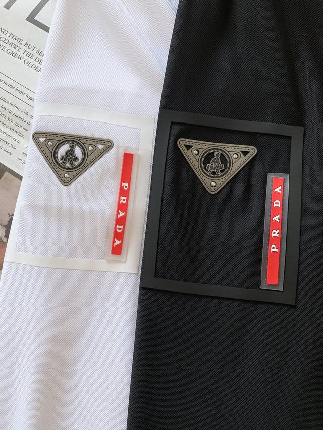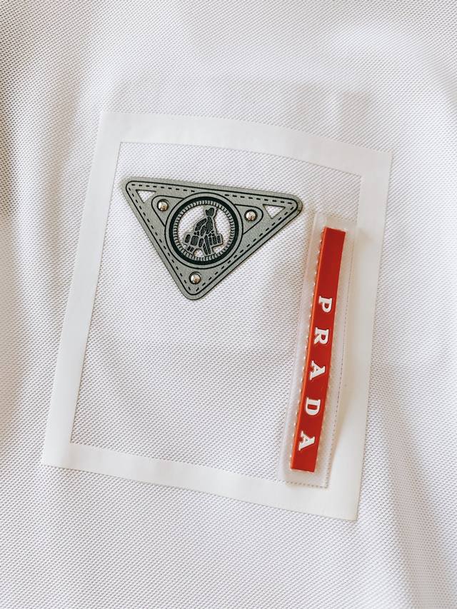 casual lapel polo shirt from the Prada Spring/Summer 2025 collection. The crisp lapel provides excellent shaping, preventing it from losing shape or sagging, no matter how long it's worn, maintaining a sharp look. The buttons at the collar are crafted from high-quality material in a warm, textured color, and they open and close smoothly, showcasing a refined aesthetic. The