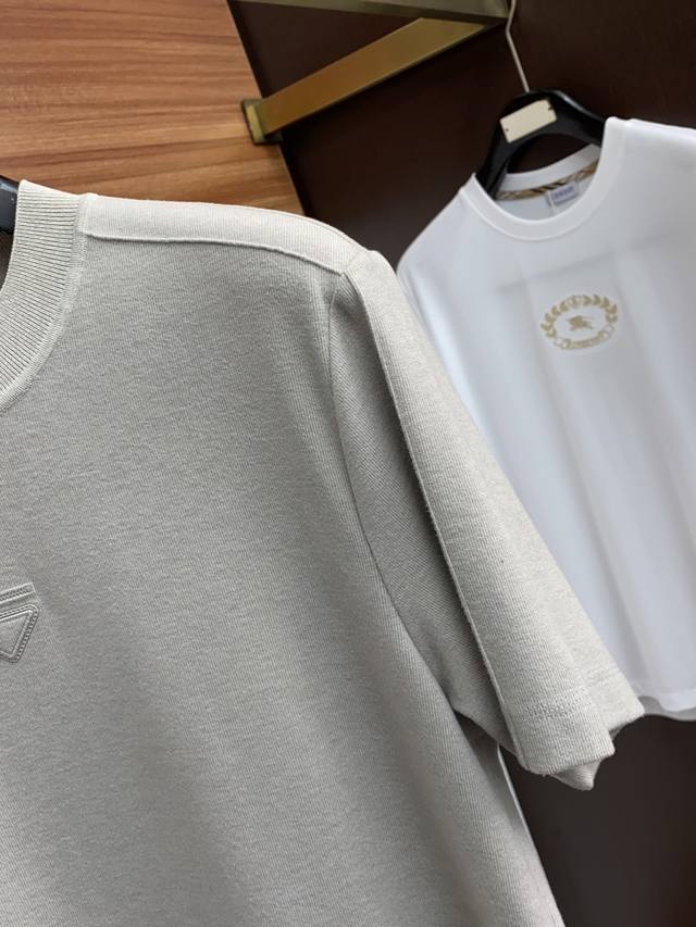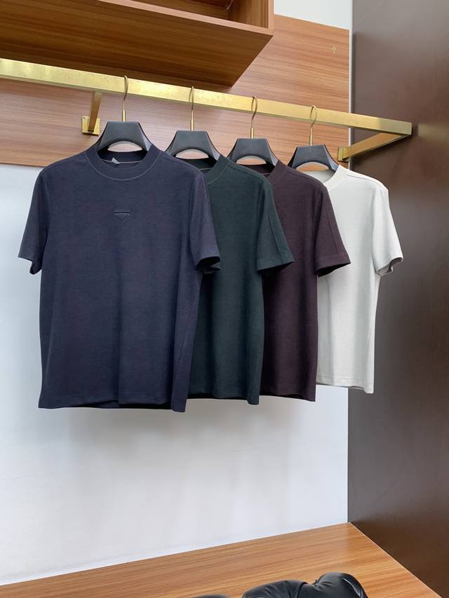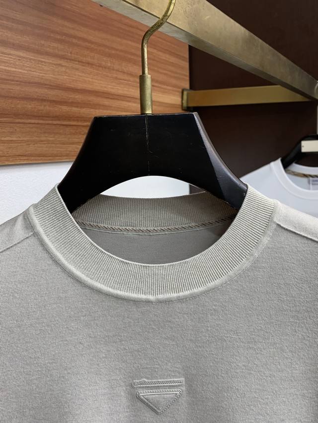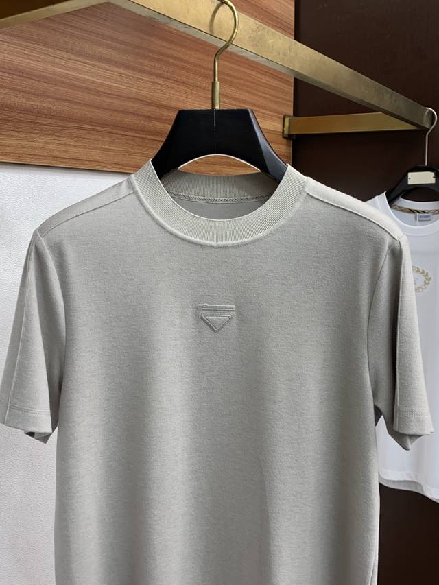 Prada's new fall/winter 2025 collection features stylish, casual short-sleeved T-shirts. Made with imported high-density, expanded warm ginger Tencel velvet for warmth, this warm, soft velvet wraps you up in the winter. Made with imported custom knitted fabrics and featuring an exquisite original logo, this piece offers both comfort and breathability. It's soft, wrinkle-resistant, elastic, and has excellent drape. Whether worn alone or as an inner layer, it's a stylish look that aligns with men's practical dressing habits, embracing a luxurious, elegant style and creating a refined, refined look for men. The visual effect is excellent, the quality is high, and it's simple and stylish, a must-have for casual business.