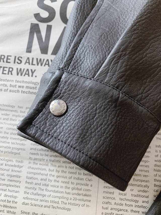 casual leather jacket, exudes a sense of luxury. The red and silver zippers clash, breaking the dull gray hue! The chest brand plaque and pocket zippers create a striking, eye-catching statement, making it a stylish statement. The zipper pulls and cuff buttons are engraved with monograms, a subtle touch that belies its sophisticated design. Every opening, closing, and fastening is a silent statement of quality. The