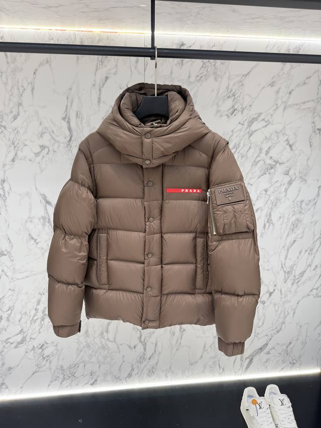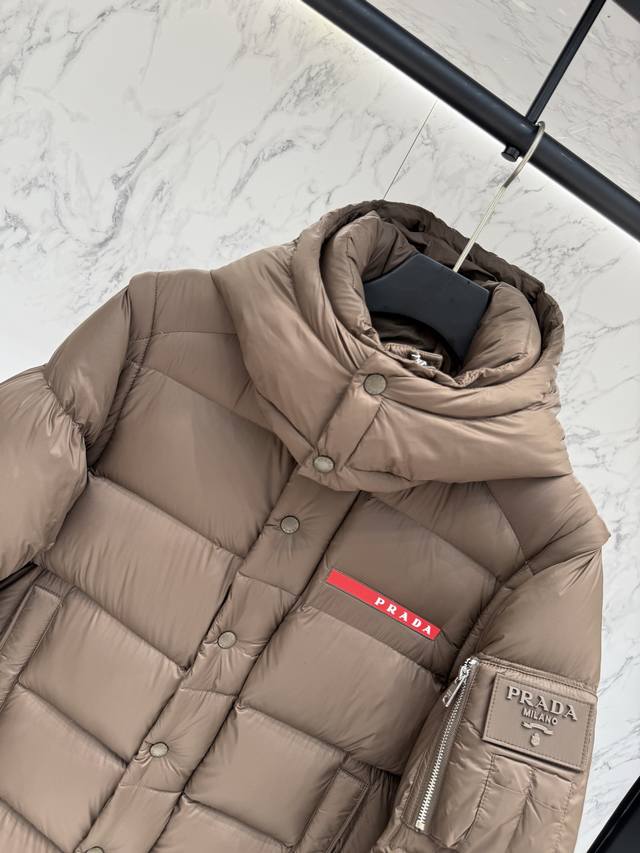 Prada's new jacquard nylon down jacket with a small metal logo. Crafted from Re