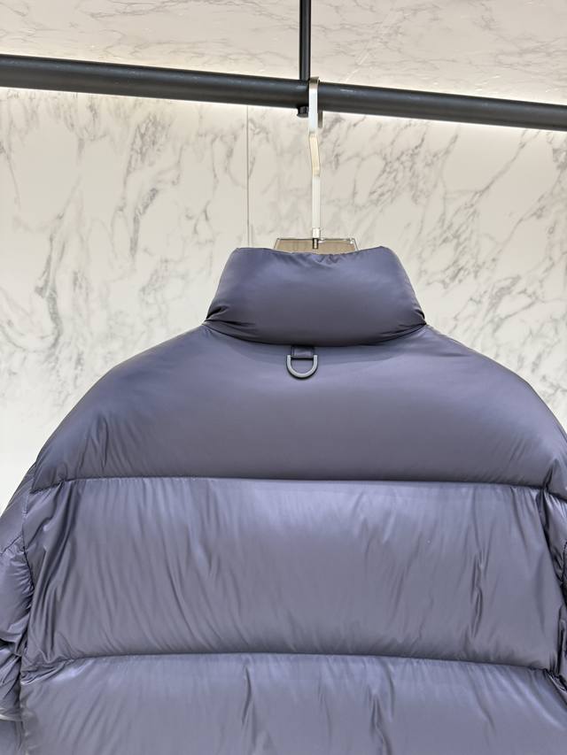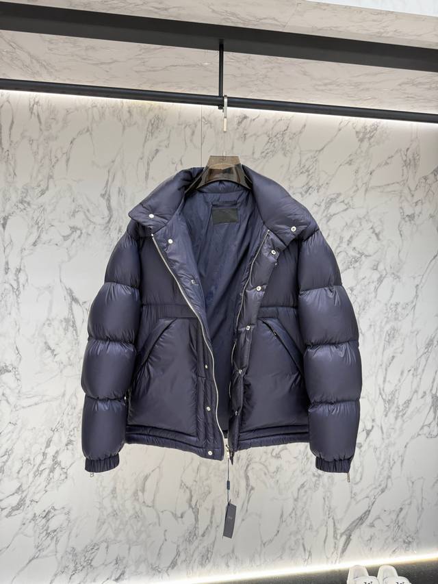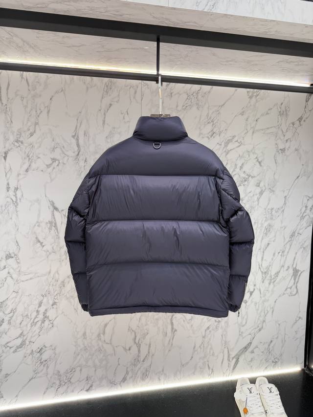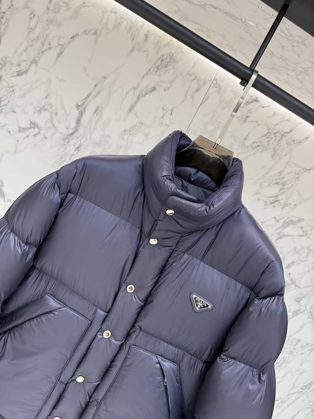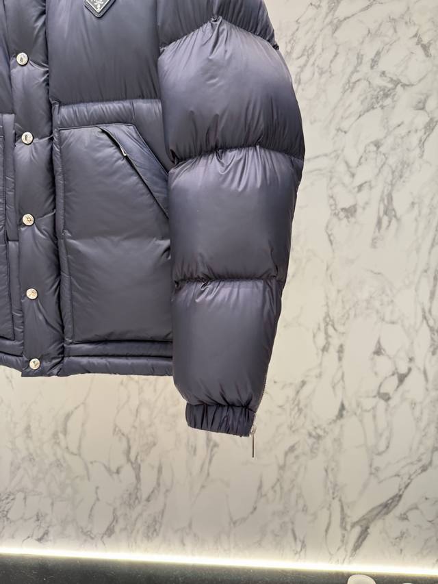 Prada's new jacquard nylon down jacket with a small metal logo. Made from recycled Re-Nylon, the jacket features a modern design that complements the silhouette. 95% white duck down provides warmth and protection, and the iconic enameled metal triangle logo further enhances the brand's style. The jacquard design is unisex! Size: R098