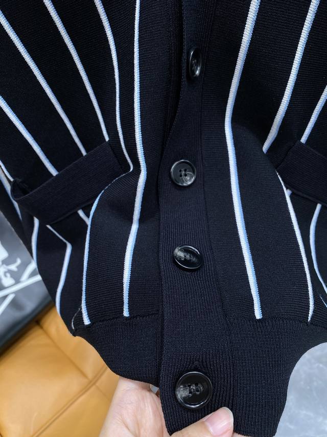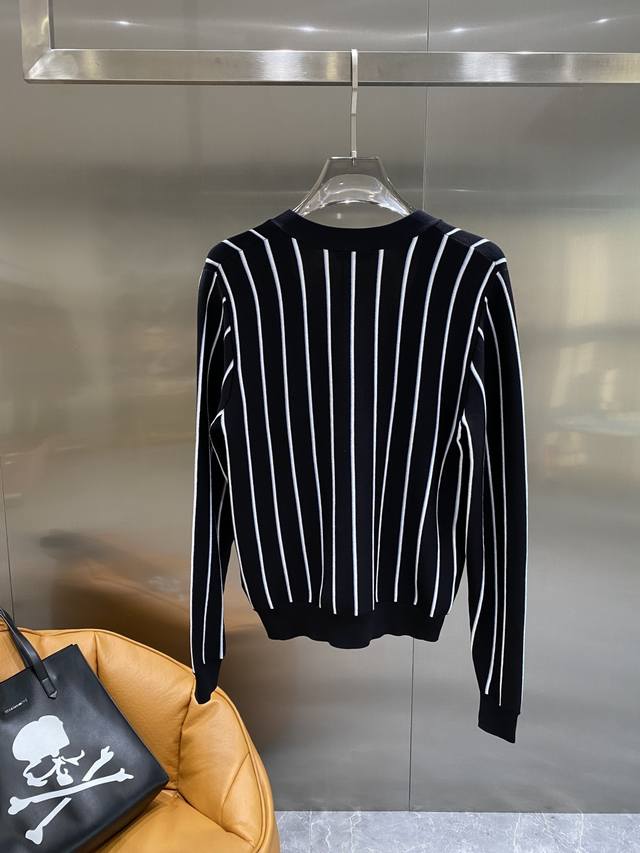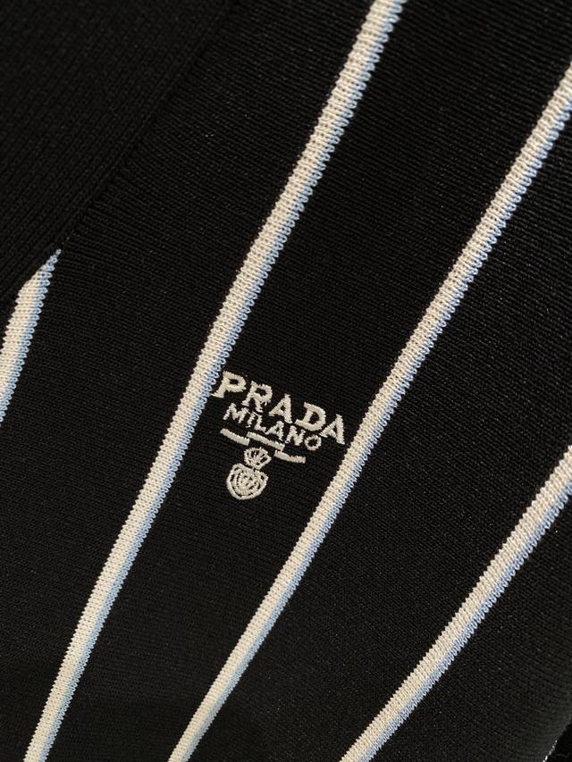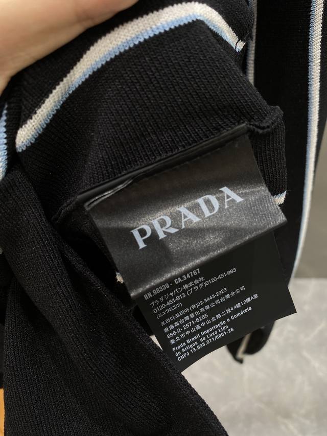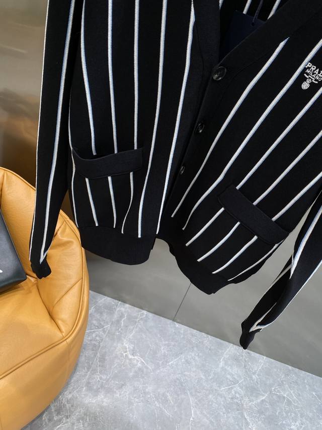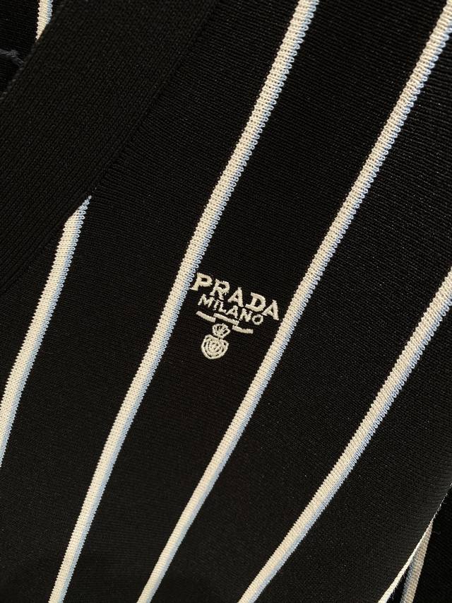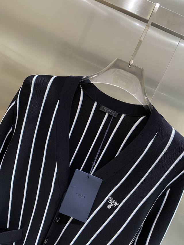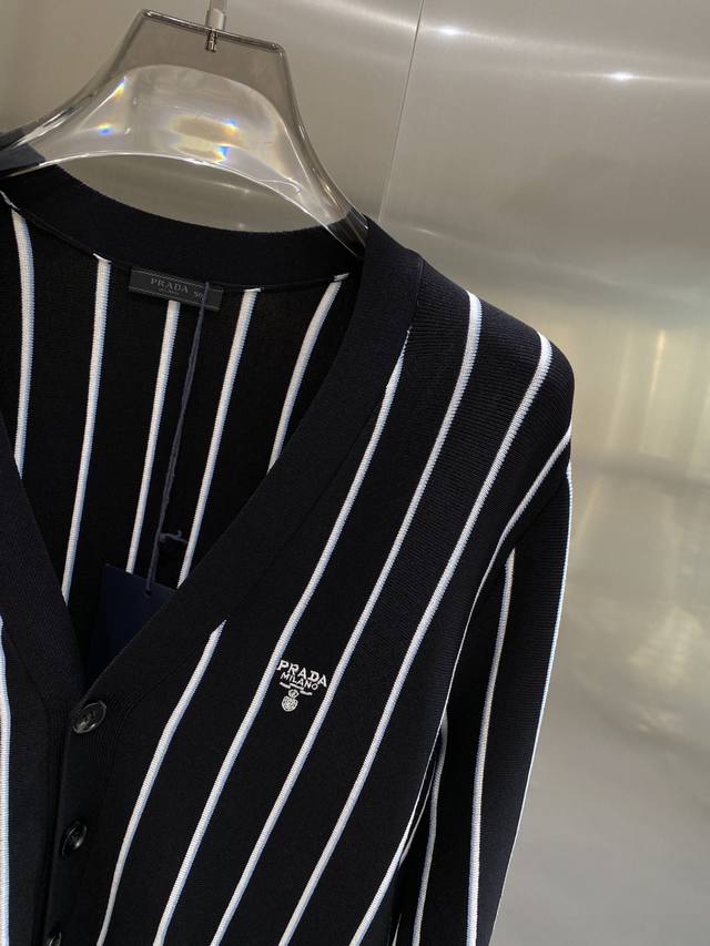Prada striped embroidered cardigan sweater, custom-woven from a classic sheep-cotton composite material. Soft, delicate, and comfortable against the skin. Black stripes weave a dreamlike, white and blue stripes like lively musical notes, interweaving across the canvas. The iconic Prada embroidery is exquisitely inlaid on the sweater, understated yet powerful. The elegant cardigan perfectly reveals the neckline, using stripes as a brush and knitting as ink to weave a new chapter in fashion. S-Xl Next Day