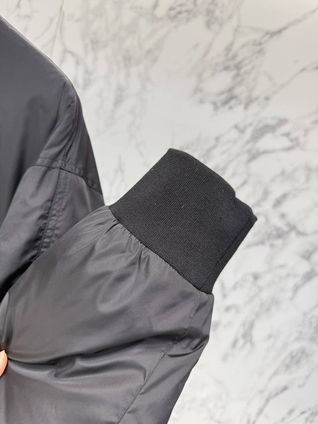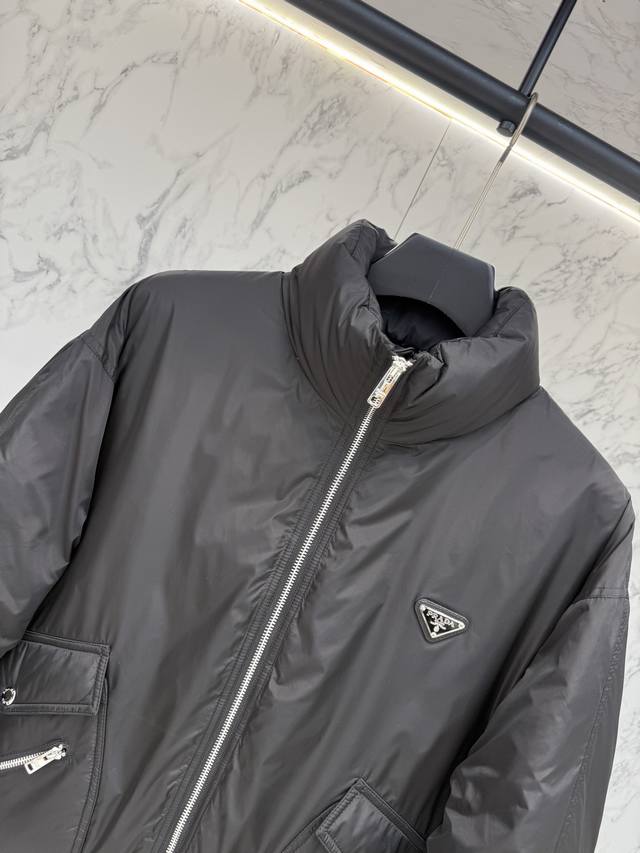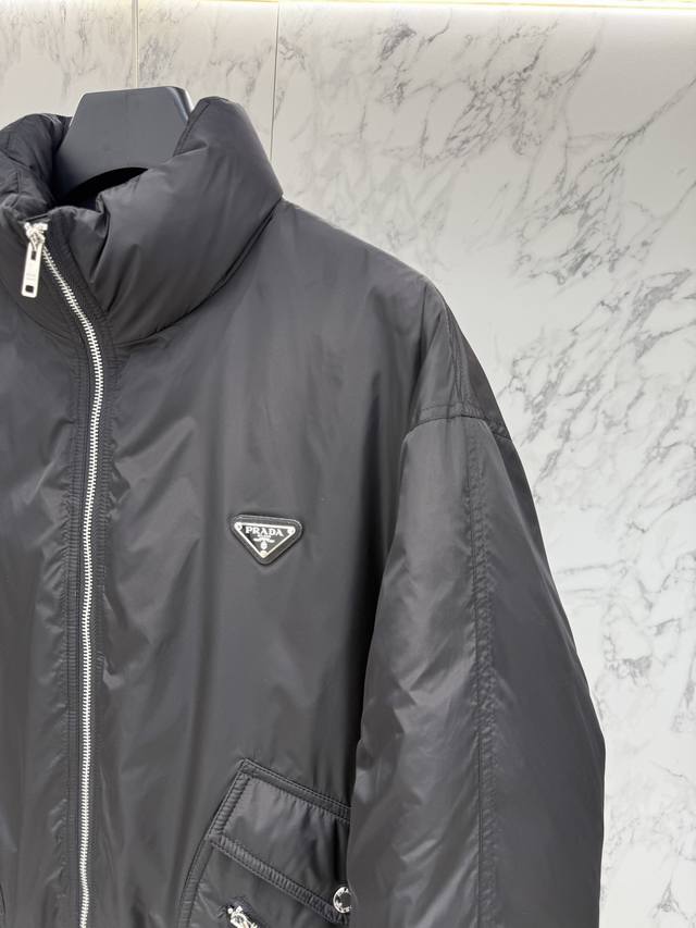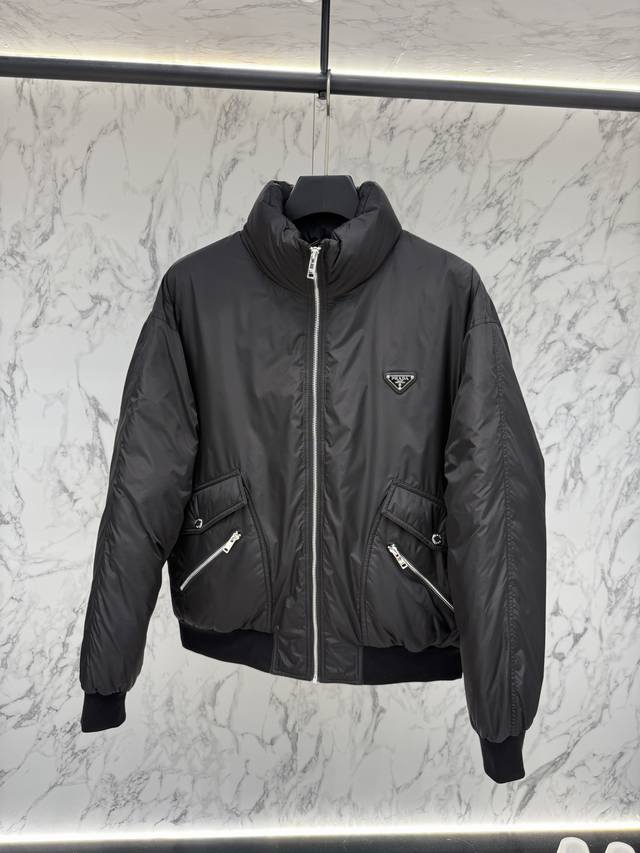 Prada's new jacquard nylon down jacket with a small metal logo. Crafted from Re-Nylon, the modern design complements the silhouette perfectly. The iconic enameled metal triangle logo further enhances the brand's style, providing added warmth and protection. The jacquard craftsmanship is unisex! Size: 4856