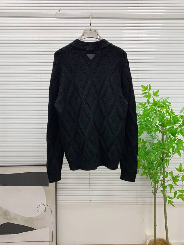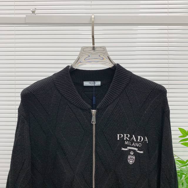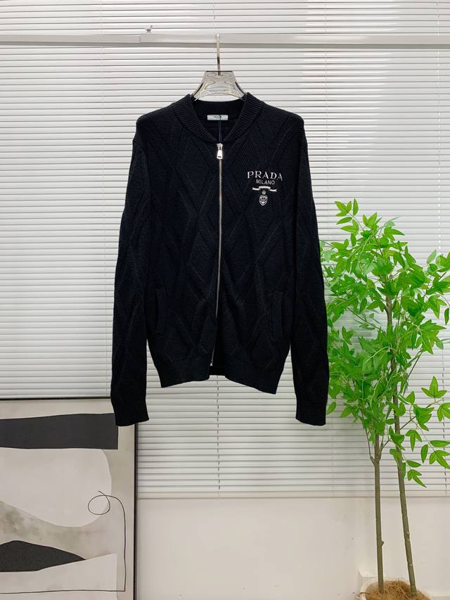 S Prada Black Diamond Pattern Wool Coat, classic baseball collar + zipper design, casual yet stylish. Colors: Black, White. Sizes: M-3XL. Recommended size: L for someone 175cm tall and weighing 140kg.