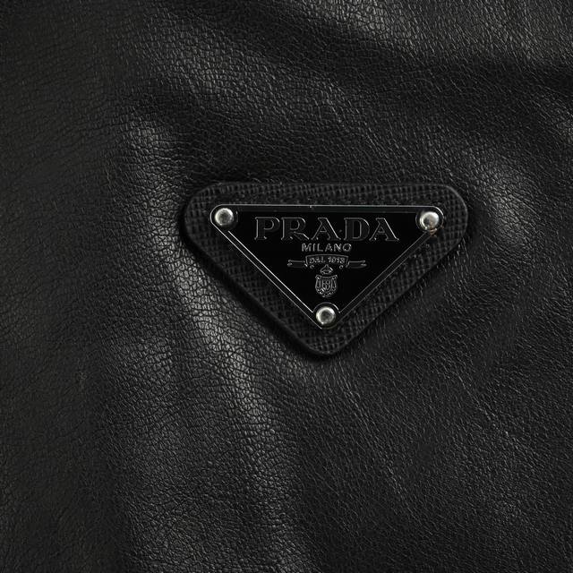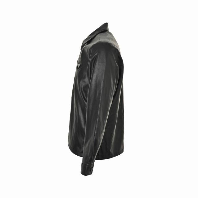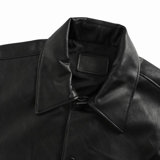 Exquisitely retouched real photos, worry-free after-sales service. Prada single-breasted leather jacket with triangular logo. Custom-made lychee-textured lambskin, 75D high-density twill nylon trench coat material. Exquisite craftsmanship and a perfect fit, naturally optimizing body proportions. Imported template machine for opening the bag, imported special machine infrared positioning, custom triangular logo, letter snap buttons, and a well-fitting design. Size: 46-52.