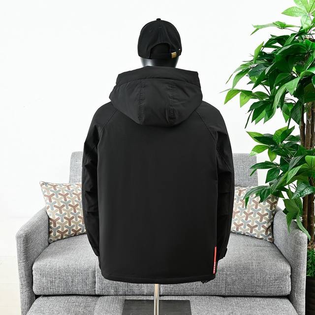 Hooded trendy style, hood is not detachable! Shoulder stitching design! Front flap zipper pockets, classic metal triangle logo, trendy