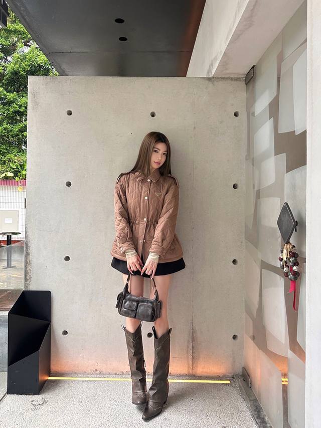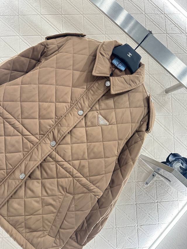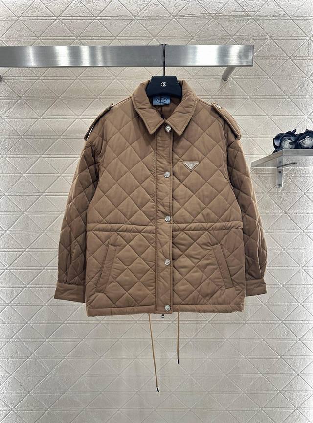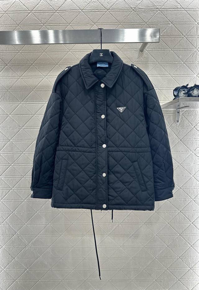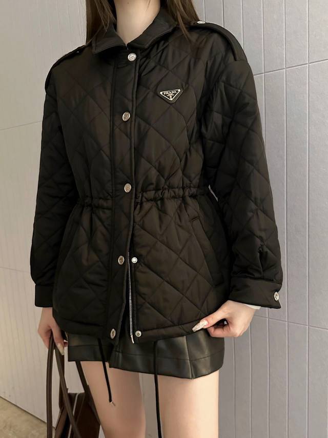 New Arrival! Prad* 2025 New Arrival: Diamond Pattern Hooded Drawstring Waist-cinching Cotton Jacket. Made with imported windproof and waterproof nylon material, replicating the original craftsmanship and upgrading the material for enhanced autumn and winter warmth. The down-filled lining makes it lightweight and warm. Features a zippered opening and buckled edging on the shoulders and sleeves. The entire jacket is quilted with a diamond pattern. Slanted pockets provide warmth and increased capacity. The design is rich and practical. An adjustable drawstring waist allows for a more flattering and supportive fit. The triangular logo on the chest adds a touch of understated sophistication, showcasing quality and breaking away from monotony. It combines warmth and style. Customized fabrics and accessories, high-quality version, 2 colors available. Colors: Black, Khaki. Sizes: S, M, L. S size recommendation: 80~100. M size recommendation: 100~115. L size recommendation: 115~135.