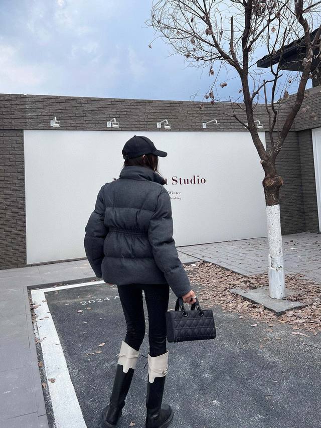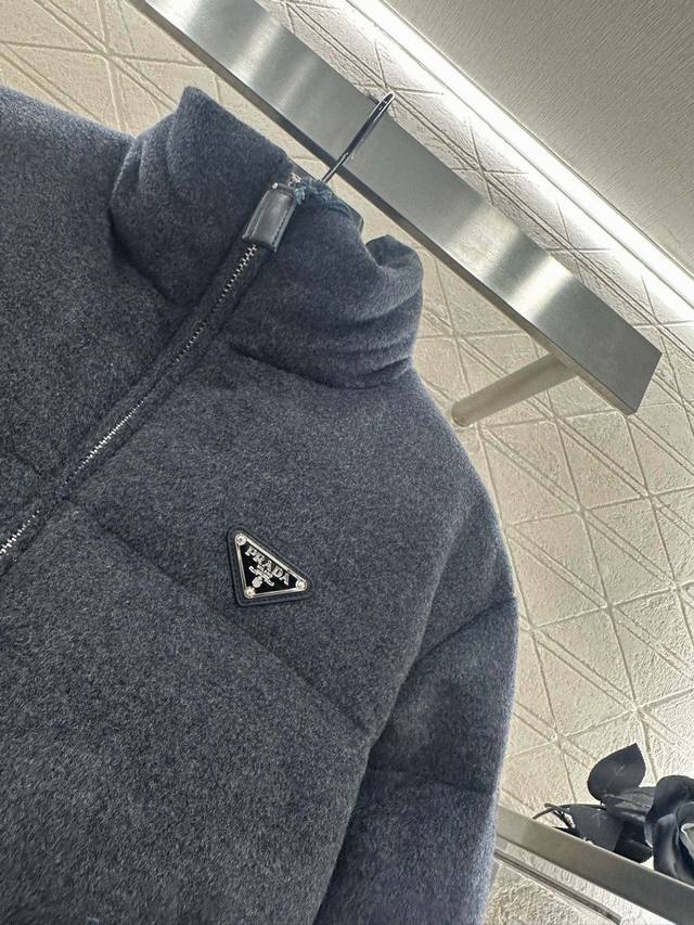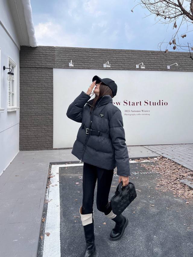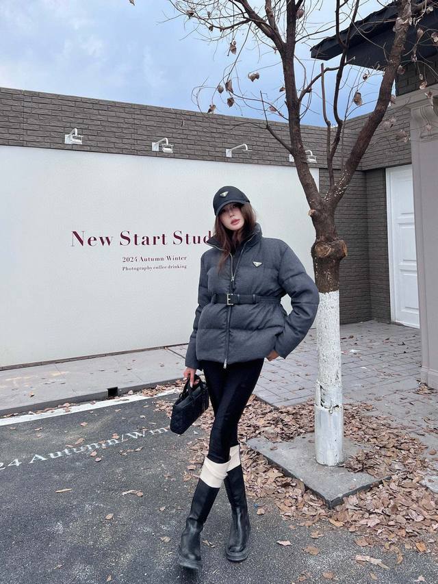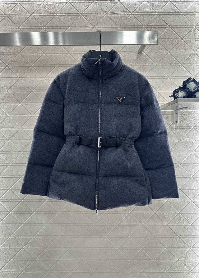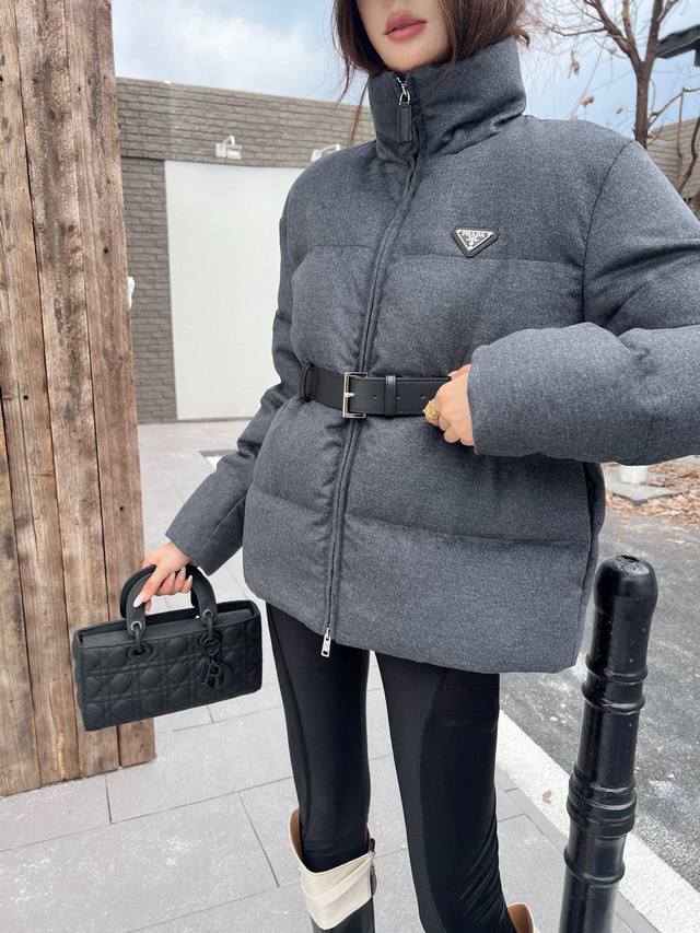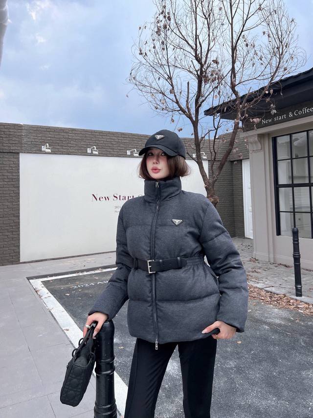 New Arrival! Prada 2025 New Stand Collar Belted Cotton Jacket. Made of custom wool, this stand collar/turn-down collar reversible slim-fit coat is warm without being bulky, offering greater versatility. The classic rectangular checkered pattern paired with the classic triangular logo exudes a sophisticated style. The elasticated belt around the waist adds a touch of elegance, setting it apart from oversized styles. Combining warmth and style, it breaks away from traditional bulky looks, making it a top choice for layering in autumn and winter. Custom fabrics and accessories ensure a high-quality finish. Color: Gray. Sizes: S, M, L. S size recommendation: 80~100 cm. M size recommendation: 100~115 cm. L size recommendation: 115~135 cm.