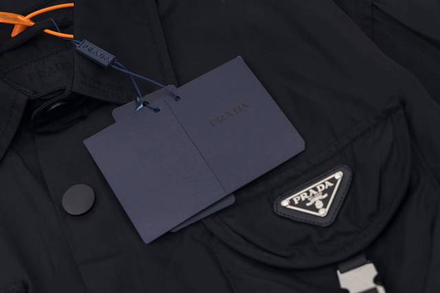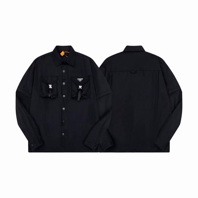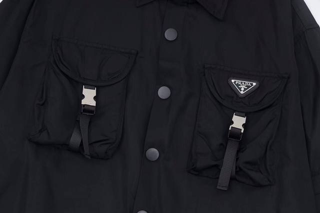 Prad* 's new spring/summer nylon collection, featuring a triangle lapel, double-buttoned pockets, a long-sleeved, detachable shirt and jacket. This year's latest design, one piece for two looks, perfect for any occasion. Made with Prad's exclusive nylon fabric. Sizes S, M, L,