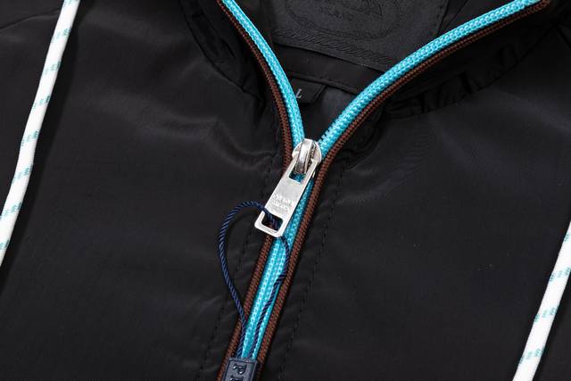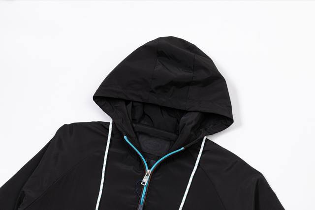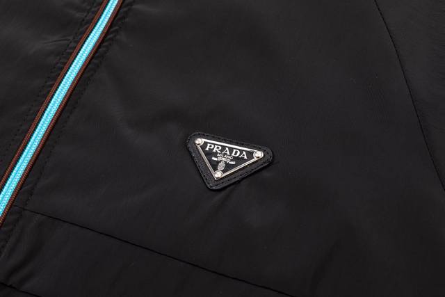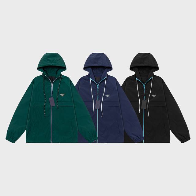 Prada 2025 Fall/Winter New Hooded Trench Jacket, official website synchronized pocket zipper design, classic five-pointed triangle leather patch style, fashionable and elegant, meticulous workmanship, neat stitching, good fit, original custom-made hardware zipper. Sizes: M-3XL. Colors: Green, Royal Blue, Black.