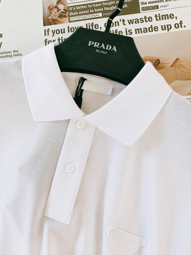 Prada 2025 Spring/Summer New Arrival Ddd Classic Triangle Logo Polo Shirt. As a renowned Italian luxury brand, Prada is known worldwide for its noble, exquisite, fashionable, and practical designs. This polo shirt perfectly blends the brand's classic style with modern fashion elements. Made from premium mercerized pique fabric, it is soft and delicate to the touch, extremely skin-friendly, and comfortable to wear. The fabric has excellent breathability and moisture-wicking properties, keeping the skin dry and providing a pleasant wearing experience for both everyday outings and casual gatherings. The classic polo collar design is simple and elegant, subtly flattering the neckline and showcasing an elegant temperament. The short sleeves are suitable for warmer seasons, offering a neat and refreshing look. The buttons at the placket are crafted with exquisite workmanship, adding not only practicality but also a touch of refined detail. The most eye-catching feature is undoubtedly the triangular logo on the left chest. This iconic logo is the symbol of the brand, presented in a low-key yet sophisticated manner, understated yet highly recognizable. The triangular logo, simple yet profound, represents the brand's exceptional quality and rich history, silently narrating its legendary fashion legacy. Available in three colors, it evokes a refreshing and vibrant feeling, full of life and energy, while maintaining a sense of composure and elegance. This unique color palette is suitable for pairing with jeans for a casual and relaxed style, or with dress pants for more formal occasions, showcasing a noble and elegant temperament. Sizes: S (Chest 104cm, Shoulder 44.5cm, Length 67.5cm, Sleeve 22cm), M (Chest 108cm, Shoulder 45cm, Length 69.5cm, Sleeve 23cm), L (Chest 112cm, Shoulder 45.5cm, Length 71.5cm, Sleeve 24cm), XL (Chest 116cm, Shoulder 46cm, Length 73.5cm, Sleeve 25cm). Sizes: S-XL