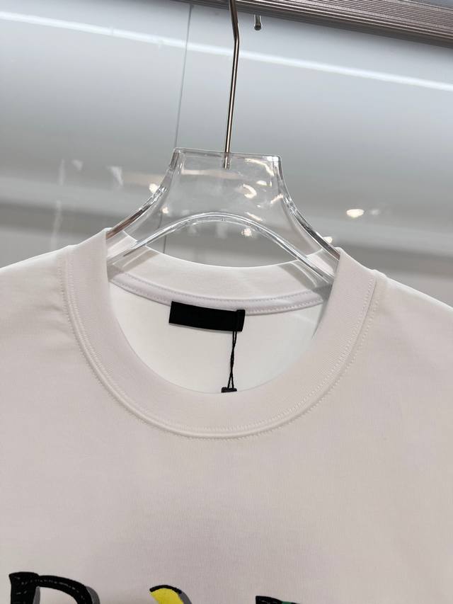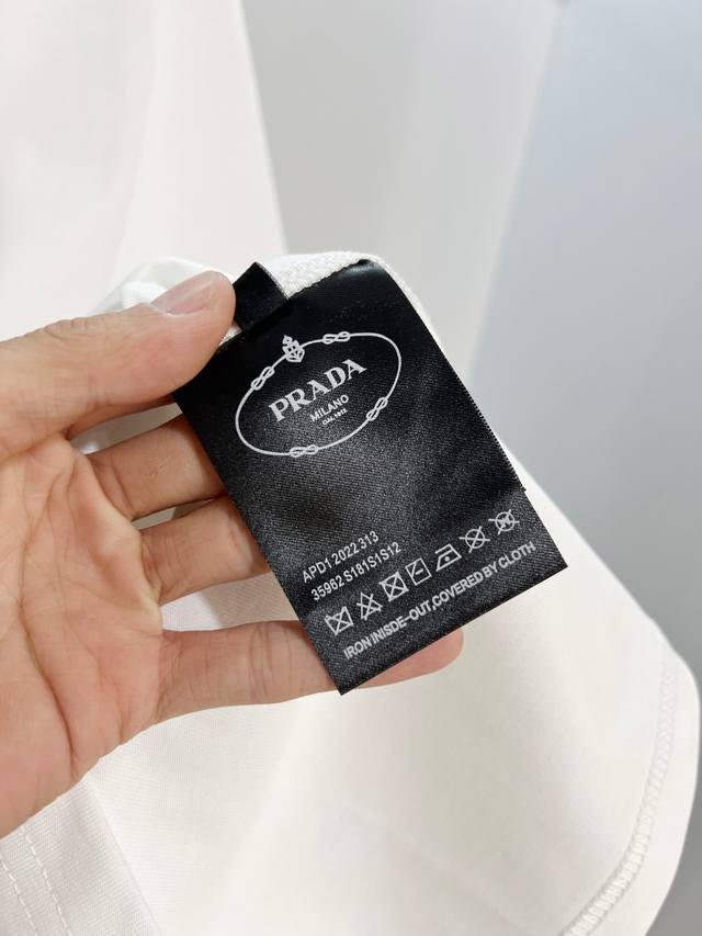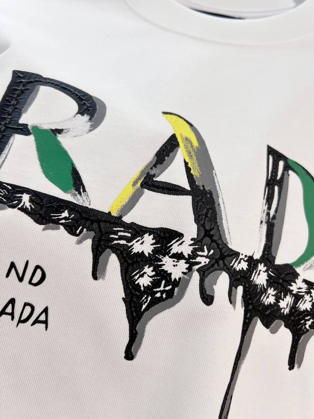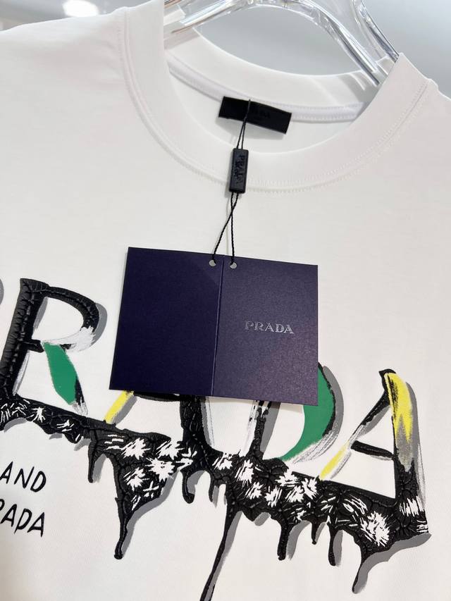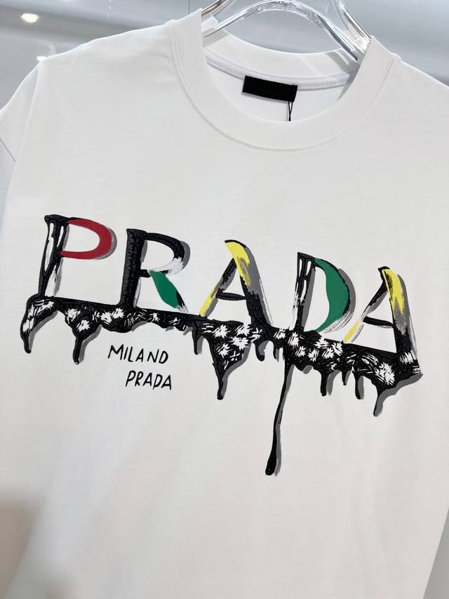 Prada 2026 New Style Official Website Synchronized Painted Graffiti Letter Logo Unisex Short-Sleeve T-Shirt, Custom 320g 100% Double Yarn Pure Cotton Fabric, Custom Dyed 32-Count Double-Strand Ribbed Fabric, Complete with Neck Label, Hang Tag, Main Label, and All Labels, Color: White, Sizes: S, M, L, XL