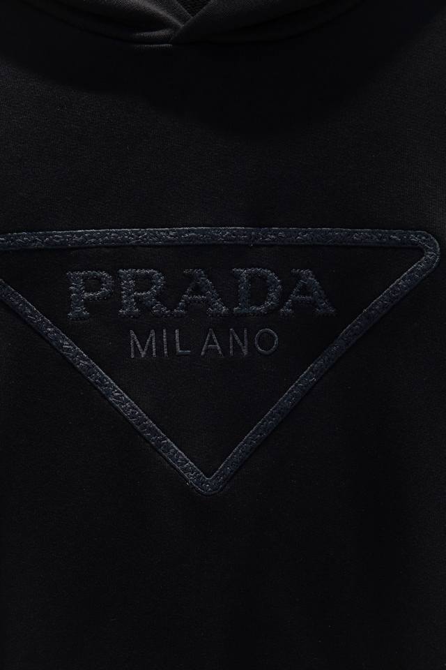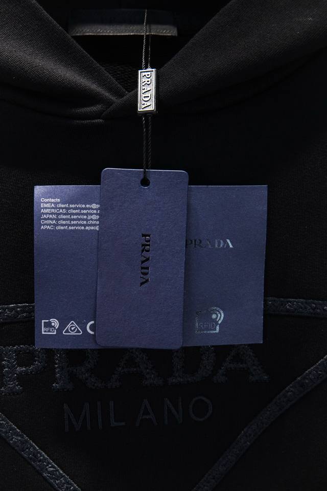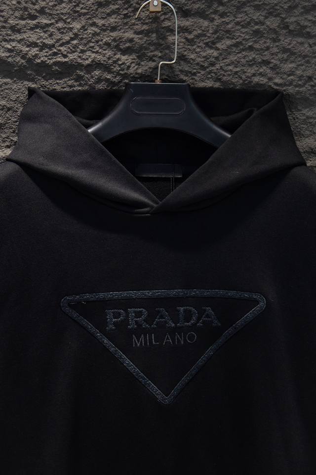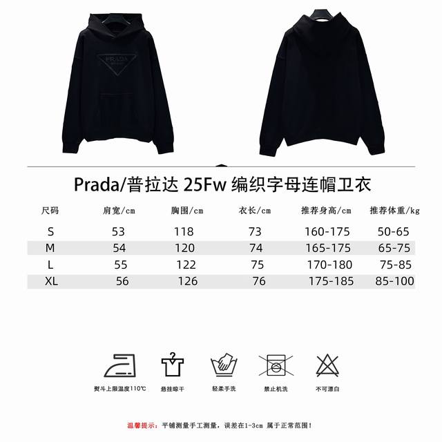Prada 25Fw Knitted Letter Hooded Sweatshirt. Made with custom-dyed terry cotton hoodie fabric, 420g double-ply double-yarn, comfortable to the touch, and crafted with imported knitting needles. Moderate thickness, with a good drape and silhouette, it's incredibly comfortable to wear! Highly forgiving for slightly chubby figures, making you look five pounds lighter! The front features #embroidered elements# artistically arranged English letters using imported Tajima high-density heavy-duty embroidery technology, giving the font a three-dimensional and full look. The garment incorporates thousands of stitches of embroidery, greatly increasing its fun and unique visual effect. The hem is loose with a double-layered fabric for a good finishing effect and exquisite edge sealing. Color: Black. Sizes: SML-XL .