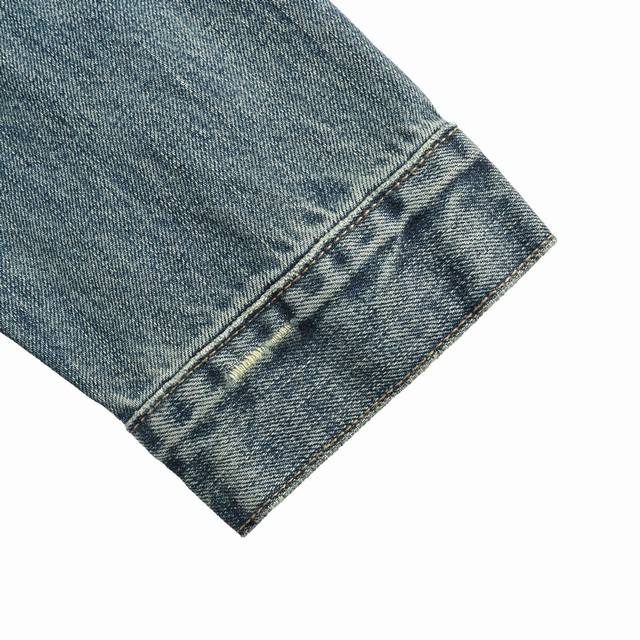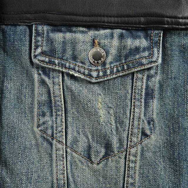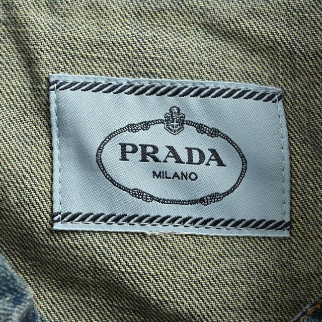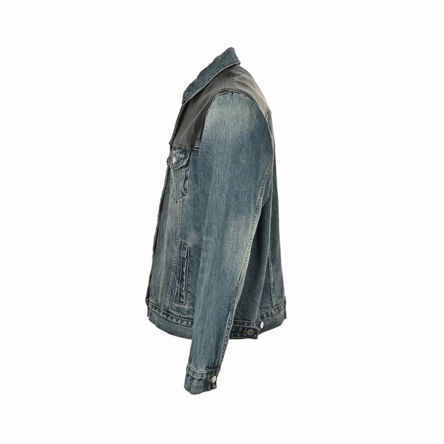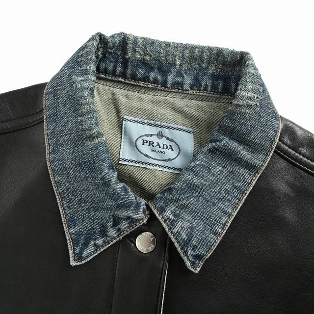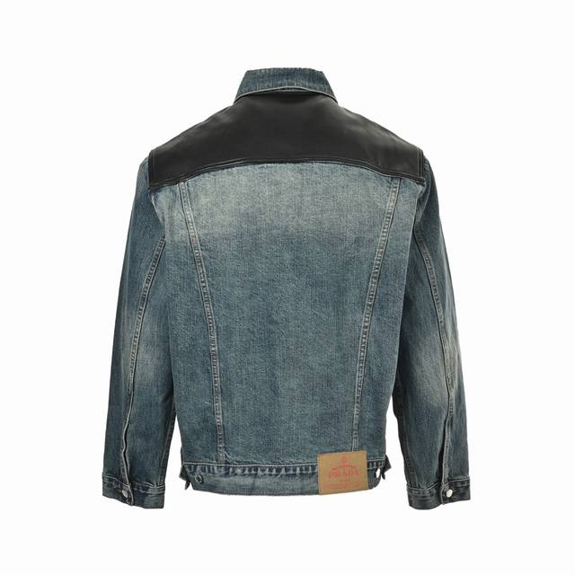Prada 25Fw Leather-Patch Denim Jacket. Custom-made washed denim fabric paired with select faux leather. Different materials are perfectly combined for a crisp silhouette. The denim fabric is stone-washed and sprayed with a monkey-like finish, giving it a premium washed and distressed look. Size: S-XL.