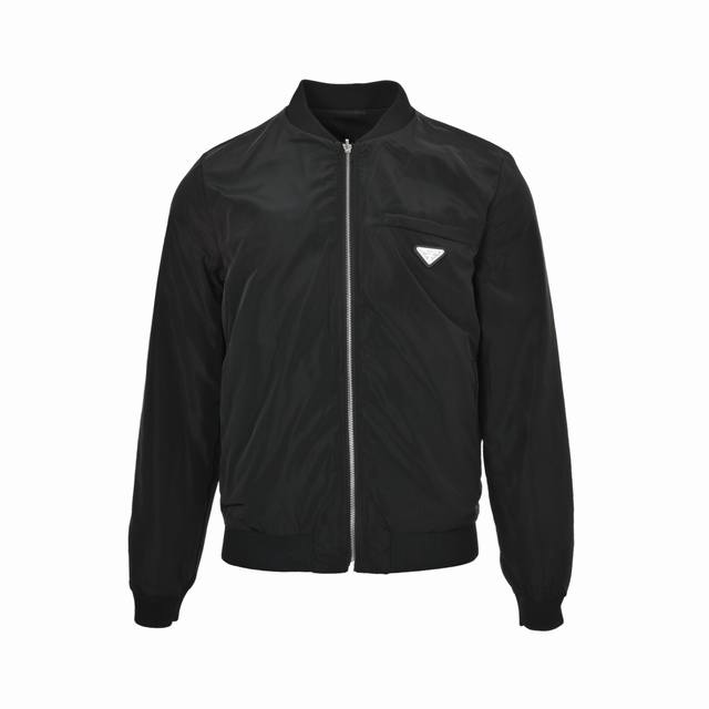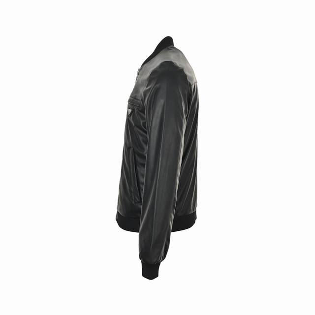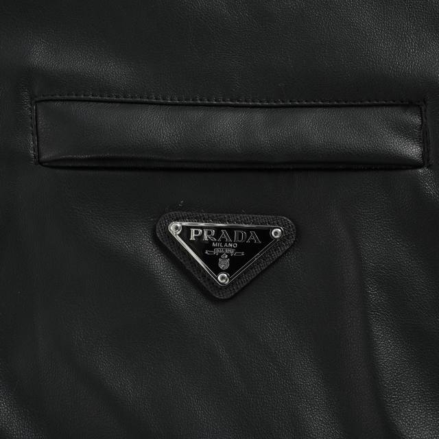 Prada 25Fw Triangle Logo Reversible Leather Nylon Jacket. One side is made of custom pebbled lambskin leather, and the other side is silky plain silk. The reversible design allows for two different looks and versatile styling. All accessories, including the triangle logo, are 1:1 custom-made. Comes with a dust bag and hanger. Size: 46-52.