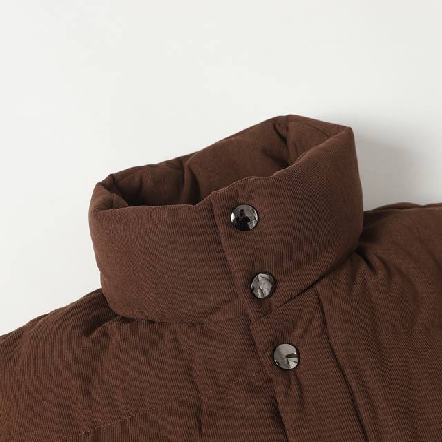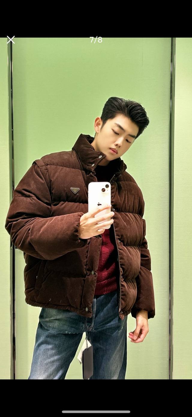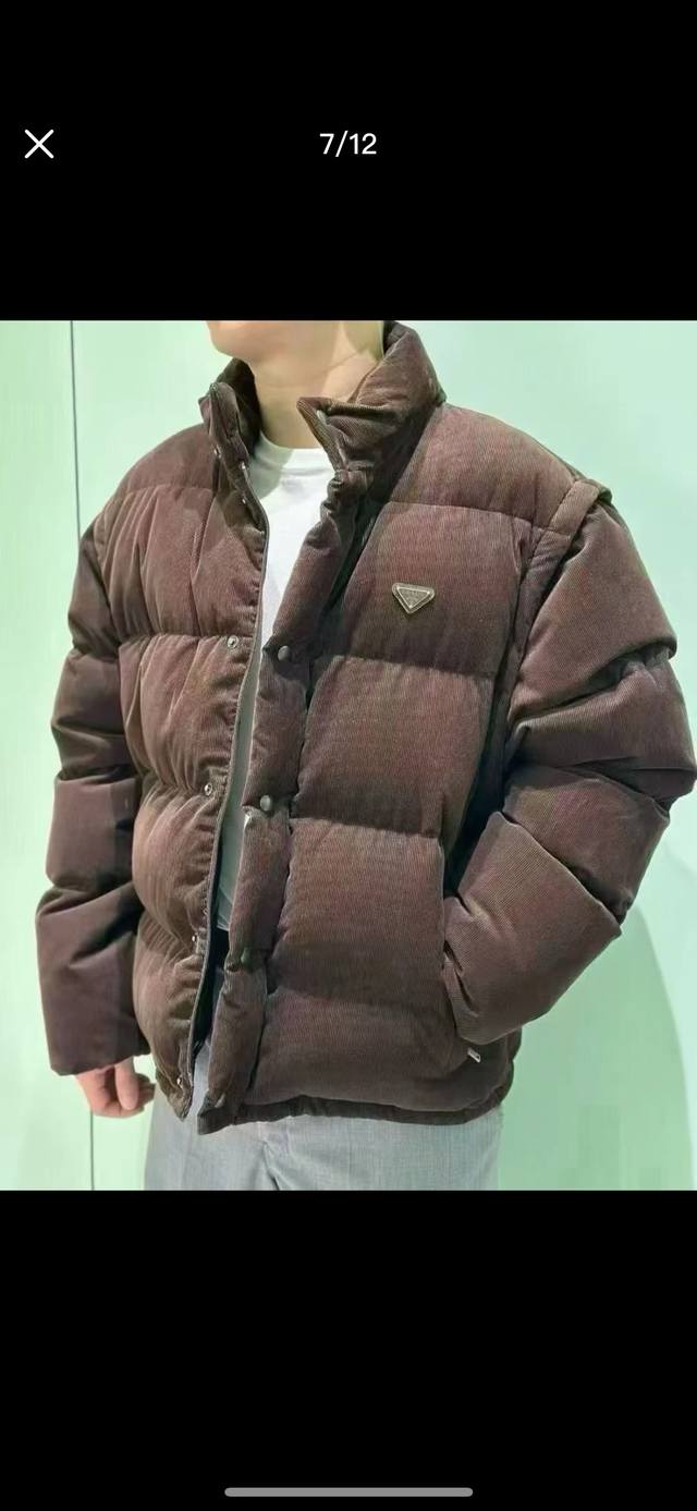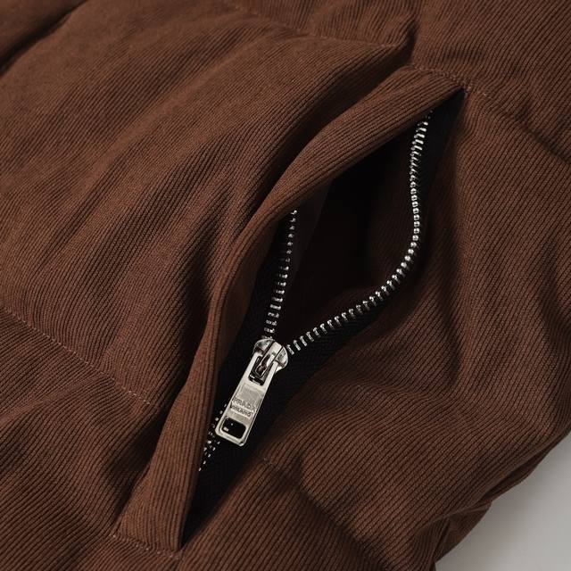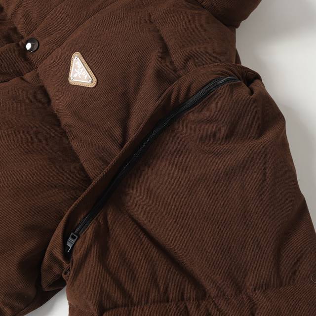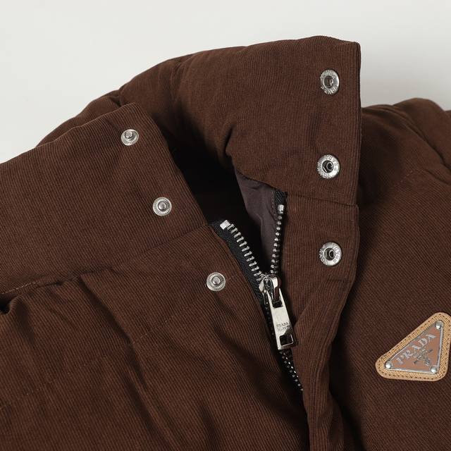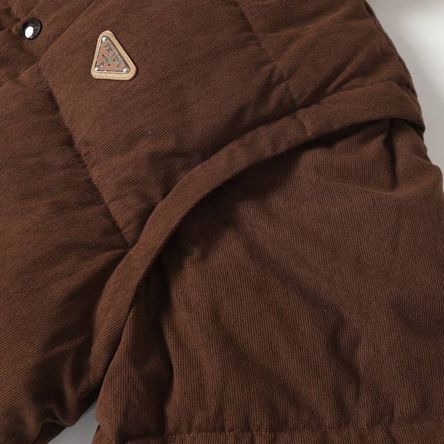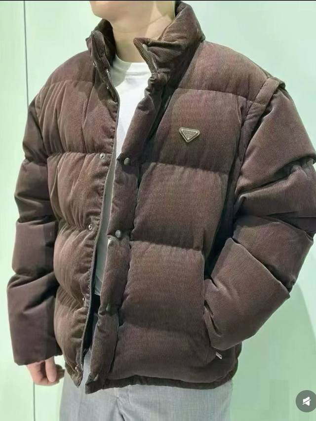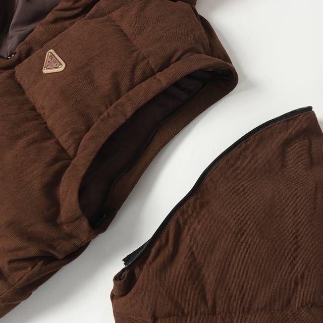 Prada 25Ss New Triangle Logo Functional Ddd Custom Velvet Corduroy with Rich and Delicate Texture and Incredibly Warm. Imagine being enveloped in a warm cloud, gently warmed by its soft glow. The main color is a serene, inky black. The iconic enamel metal triangle logo adorns the chest, understated yet powerful. The stand-up collar is crisp and stylish, precisely fitting the neckline. The hidden hood design acts like a mysterious guardian, and the cleverly designed detachable sleeves transform the garment into a lightweight piece that effortlessly reveals its unique charm. The style can be freely switched, making it a leader in urban fashion with its unique charm and fearless attitude. Ddd The fabric has been hand-washed for a better feel and texture, making it less prone to deformation, shrinkage, and fading, maintaining its long-lasting beauty. Unisex. Ddd Function 1: Detachable sleeves for free style switching. Ddd Function 2: Hidden hood for storage. Ddd Fit: Loose fit. Ddd Sizes: S, M, L, XL. Ddd